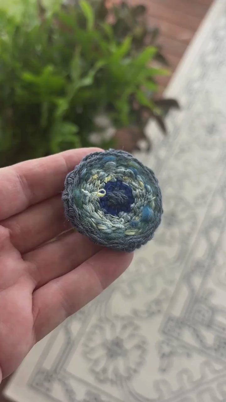 This handwoven brooch has a 100% wool felt backing with a brooch pin closure.