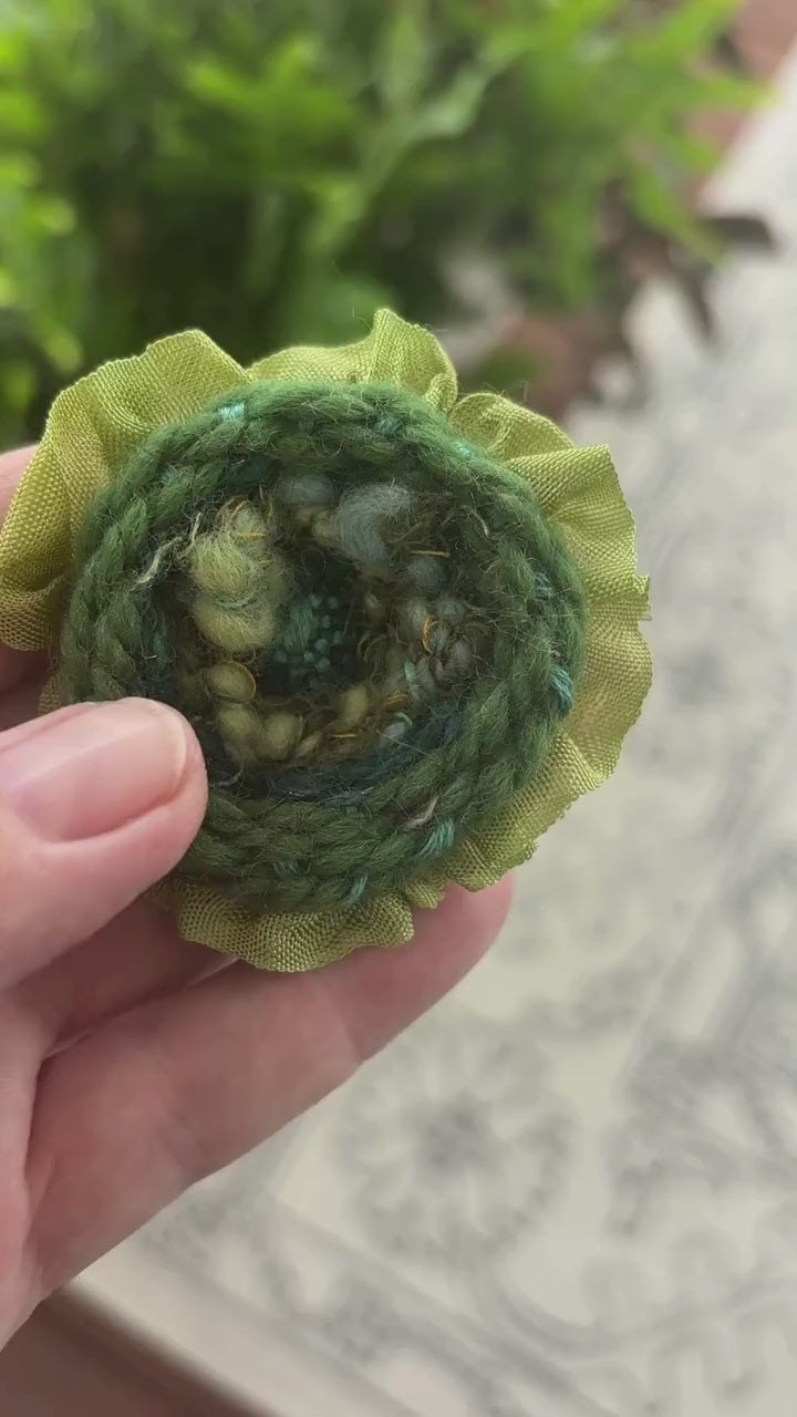 Woven in shades of green, it includes a silk ribbon ruffle and other textural fibres.
