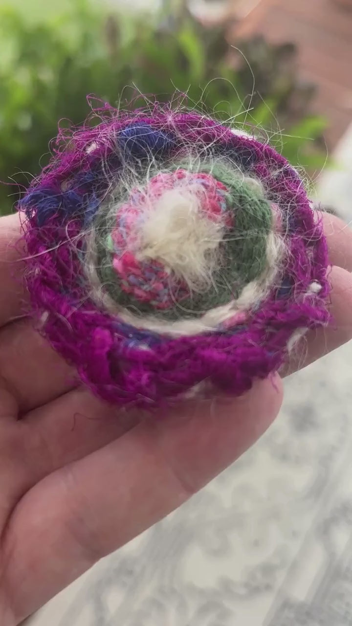 Gorgeous handwoven brooch in purple with hints of green and pink (it's like a little flower!), includes recycled sari silk yarn and lots of texture (just look at that profile pic).