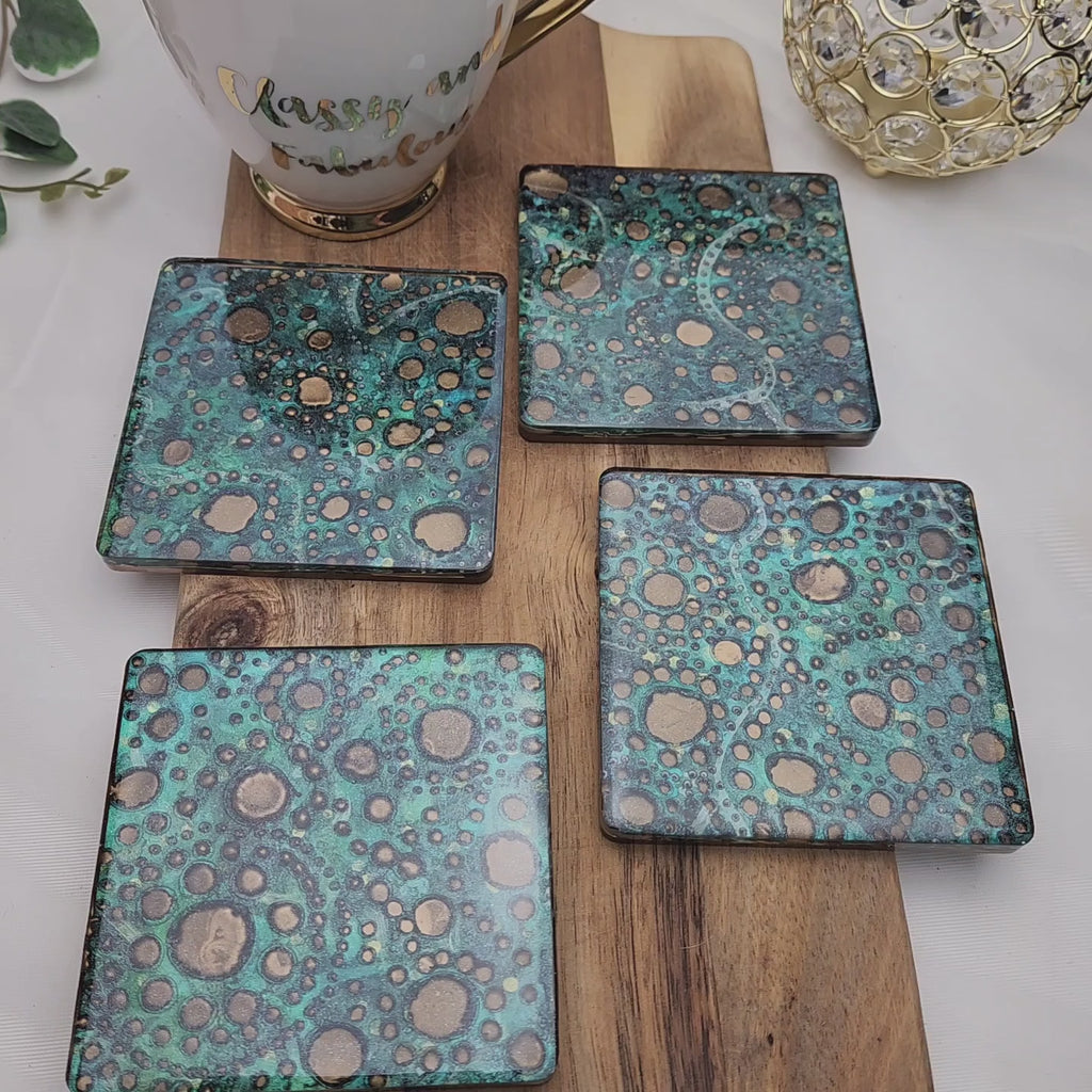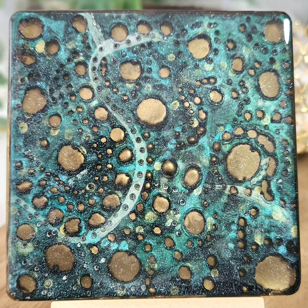 Each piece is made from high-quality epoxy resin for durability and heat resistance, featuring a mesmerizing shiimmer of pearl blues and greens against a backdrop of rich Aztec gold. The result is a striking design that catches the light beautifully and brings a pop of elegance to any space.