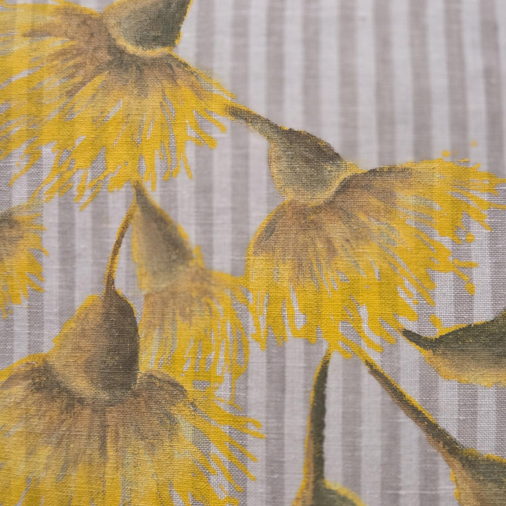 This design is inspired by the bright Australian Eucalypt Melliodora- Honey Box Blossoms. This design is created by hand screen printing the base colour of the blossoms and then hand painting the details. The cushion cover is pure French linen with a white grey stripe and a ruffled edge. Each cushion cover's design is unique in that the details are hand painted individually to achieve a painterly appearance.