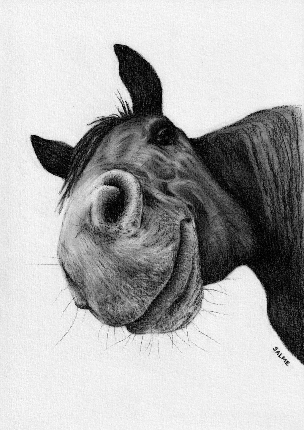 Who knew horses had so many chin whiskers?! Along with their snout’s sensory nerves, they are used to explore their environment the way humans do with their hands. I used charcoal pencil to capture the smooth, velvety texture of the snout. This cheeky darling is either feeling playful, or is looking for a treat!