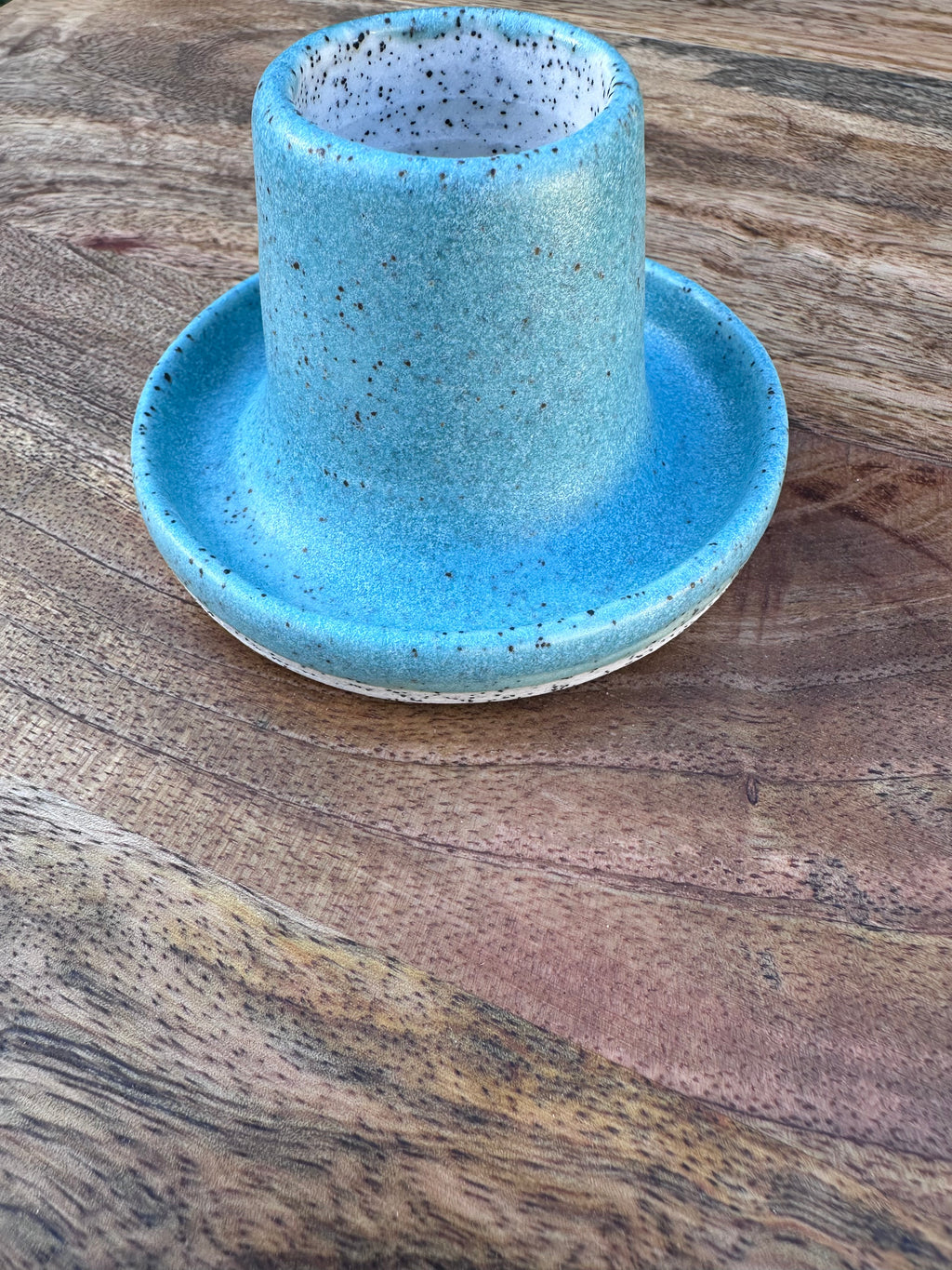 Finished in a soft turquoise glaze that breaks gently over natural iron speckles, each piece feels like sea spray over stone. The wide base catches wax drips while the tapered centre holds a standard 2cm dinner candle securely.