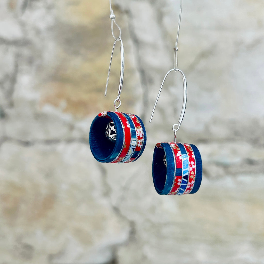 Colourful red blue white and silver circular earrings crafted from upcycled Japanese Shibori fabric and lacquered Japanese washi papers with silver thread detail. Suspended within each earring is a beautiful decorative silver bead - contemporary sterling silver ear wires. These unique earrings are an elegant accessory, light and fun to wear, perfect for casual or evening wear. They dangle & dance beautifully around your face. The earrings are strong & don't bend or crush as each piece of decorative textile & paper is wrapped/glued around 100 - 130gsm art paper using acid free adhesive.