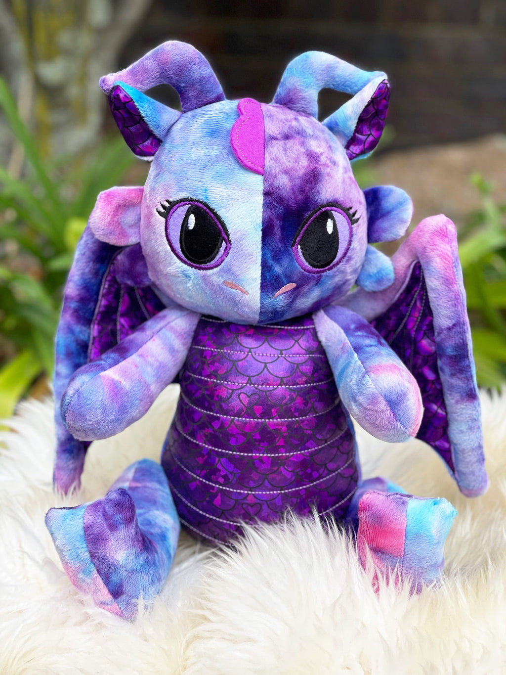 They offer a plush and huggable feel, while their embroidered features add a touch of whimsy to their delightful faces. Each has an array of special features and you have the freedom to select the base color and the holographic color pops, style of eyes/colour, spikes, horns, and wings, allowing you to personalize your dragon to match your little ones imagination.