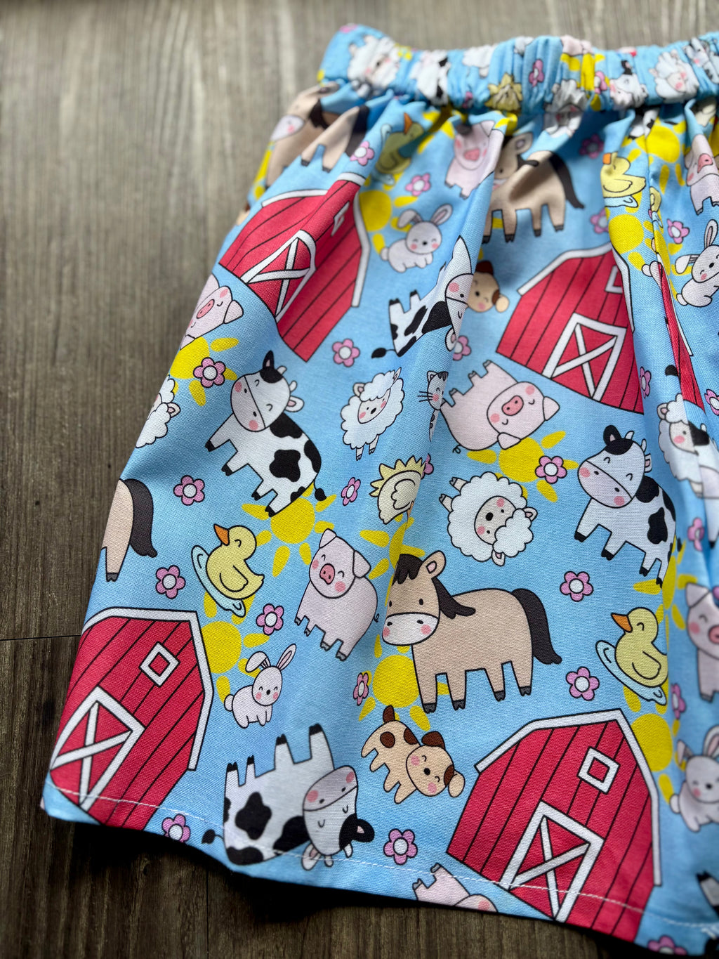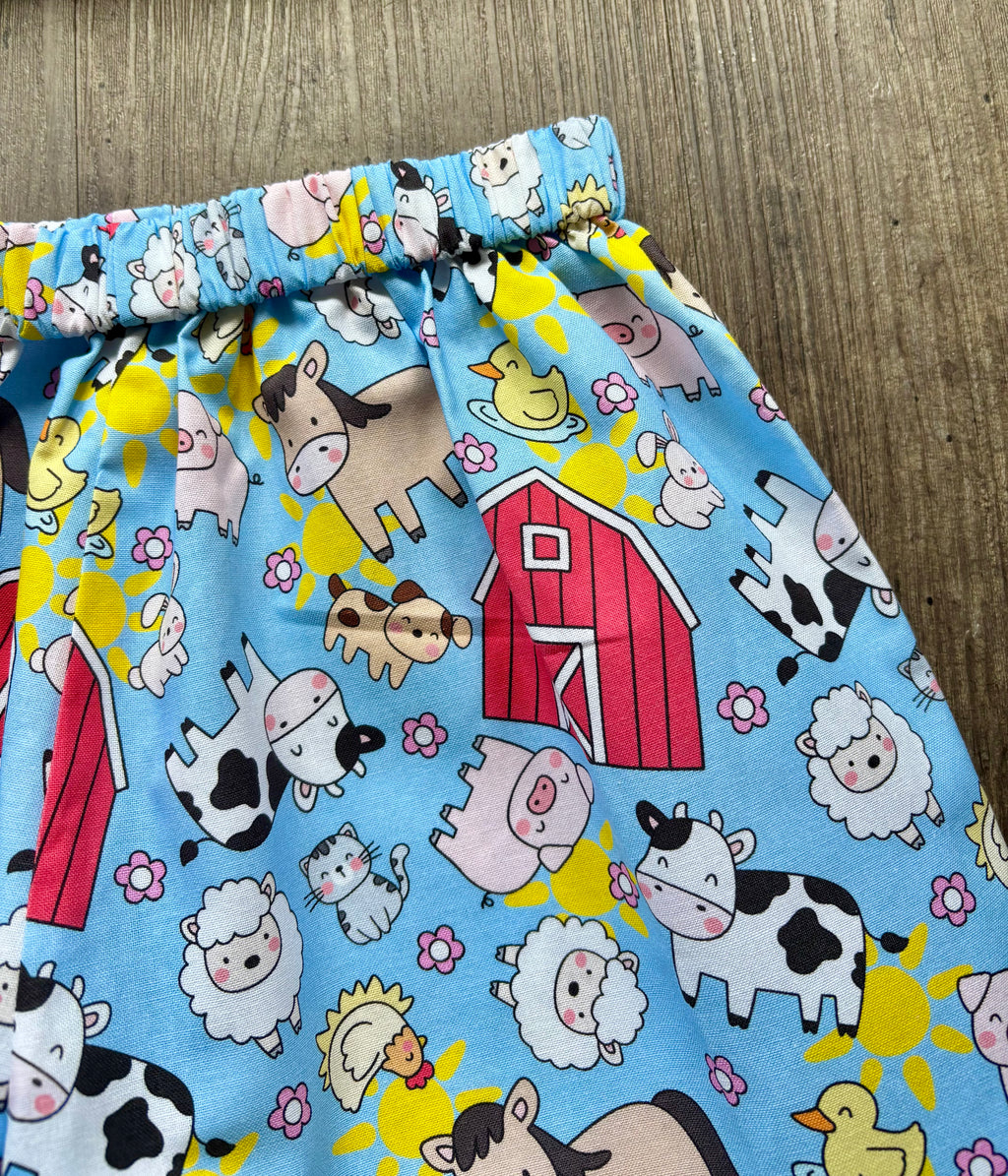 Adorable hand-sewn cotton shorts for little ones in a playful farm print. Soft, breathable cotton with an elastic waistband for a comfortable, easy fit. Perfect for everyday play and adventures, these shorts are made with care and attention to detail.