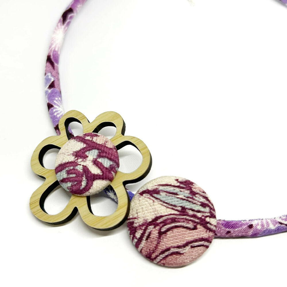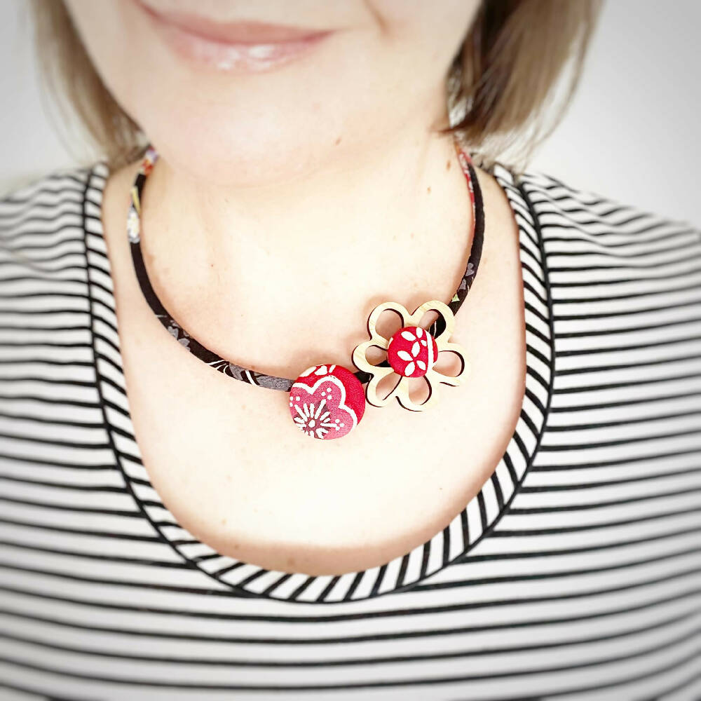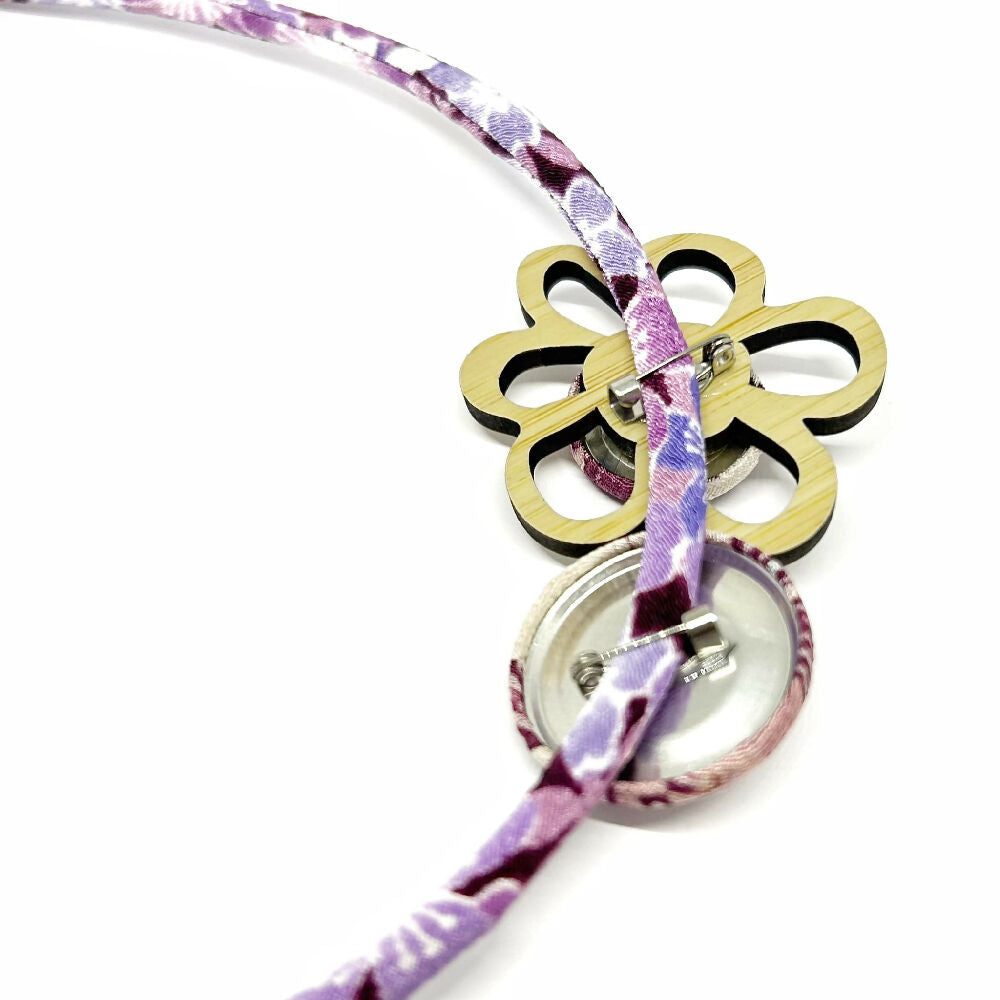 The Neckwire is covered in kimono cord. It features two button brooches which have been individually hand covered using a small piece of vintage kimono.