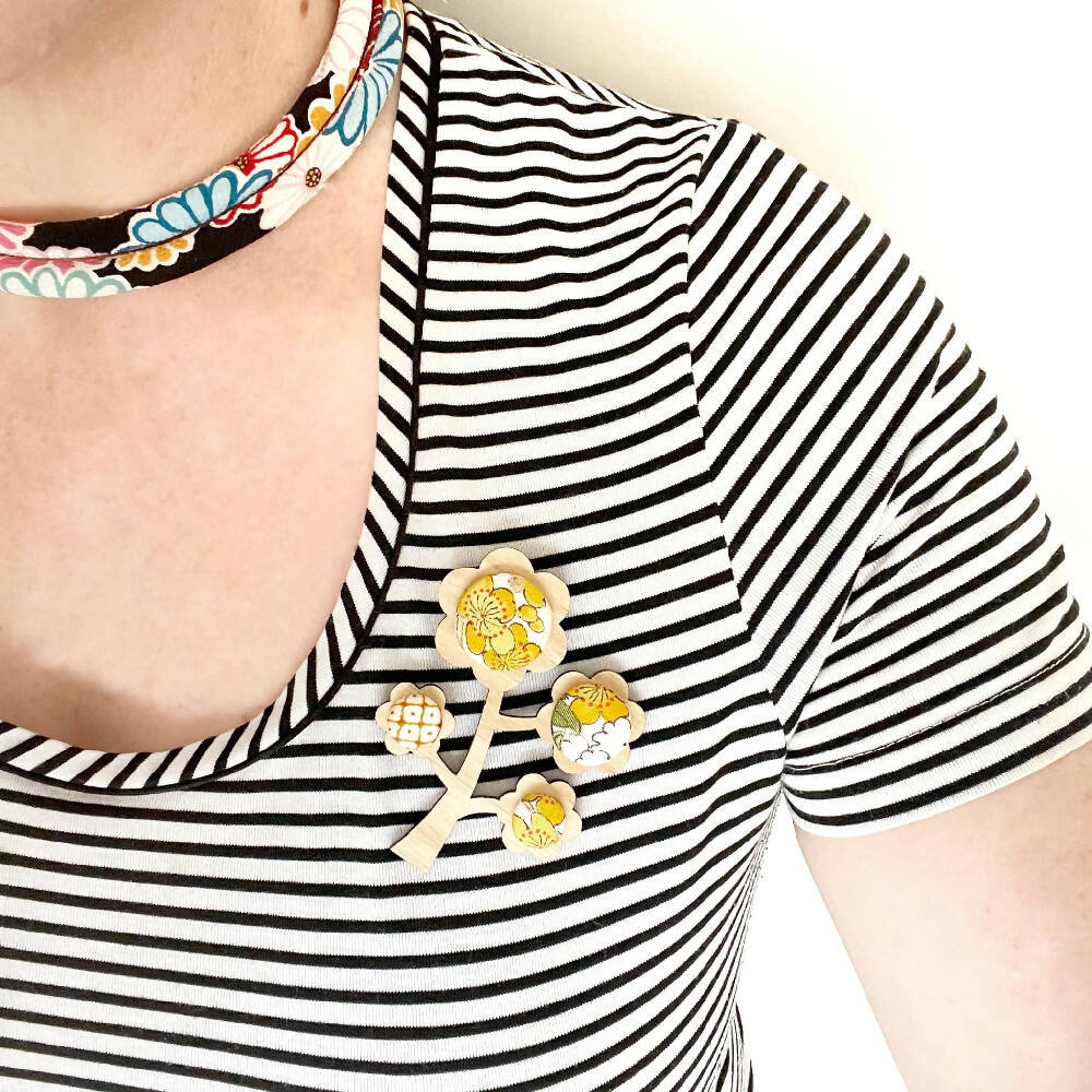 This original Kimono Tree Brooch is handmade by me using laser cut Tasmanian Oak and Vintage Kimono Buttons.