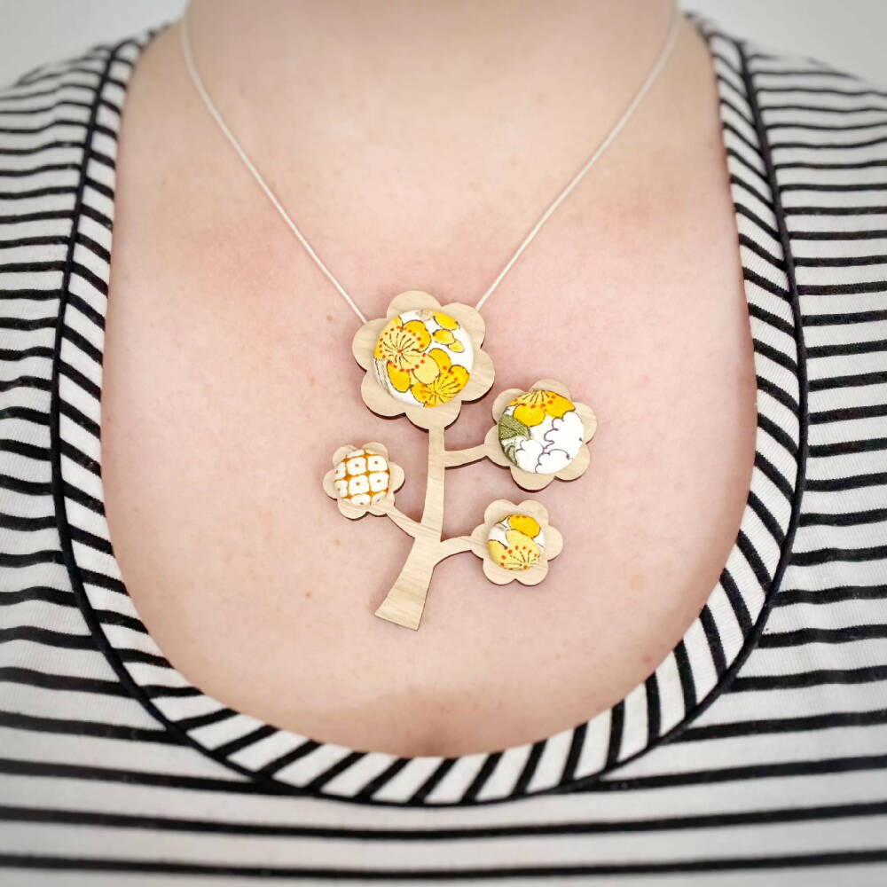 The buttons have been individually hand covered using small pieces of vintage kimonos. Securely attached to the back of the tree is a silver-plated brooch pin (with a bail) so it can be worn as a necklace also. Each tree is a 'one off' original and a fantastic statement piece.