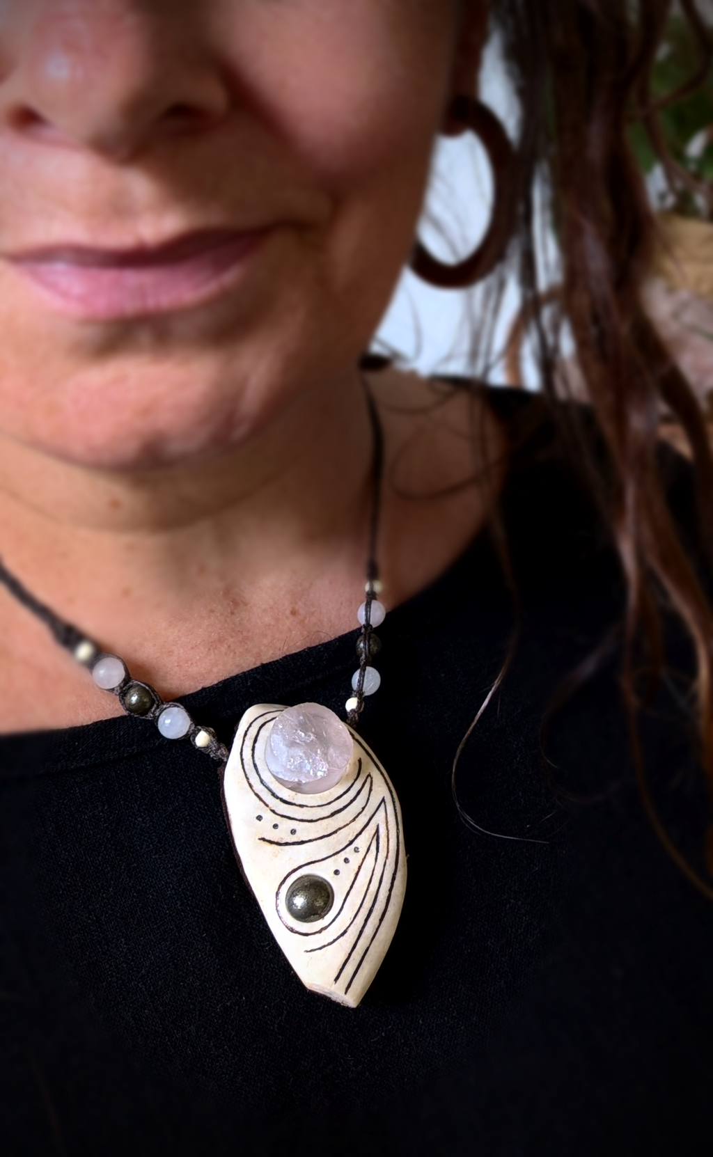 Each and every one of these creations holds a very definite vibration. During the making of or finished its name and story comes to me intuitively. Each piece is cut and carved by myself. Gemstones used have been hand selected, some I’ve cut and polished at my local lapidary club ready to be to be set. All pieces are woven with waxed linen with some beaded gemstone & bone (reused).