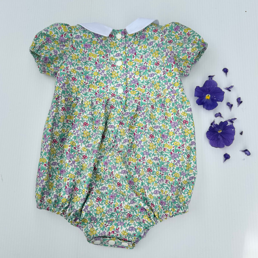 A beautiful baby playsuit made from classic Liberty fabric, carefully handmade and finished with delicate hand embroidery. Designed to be both pretty and practical - perfect for everyday wear, special outings ,baby showers or gift.
