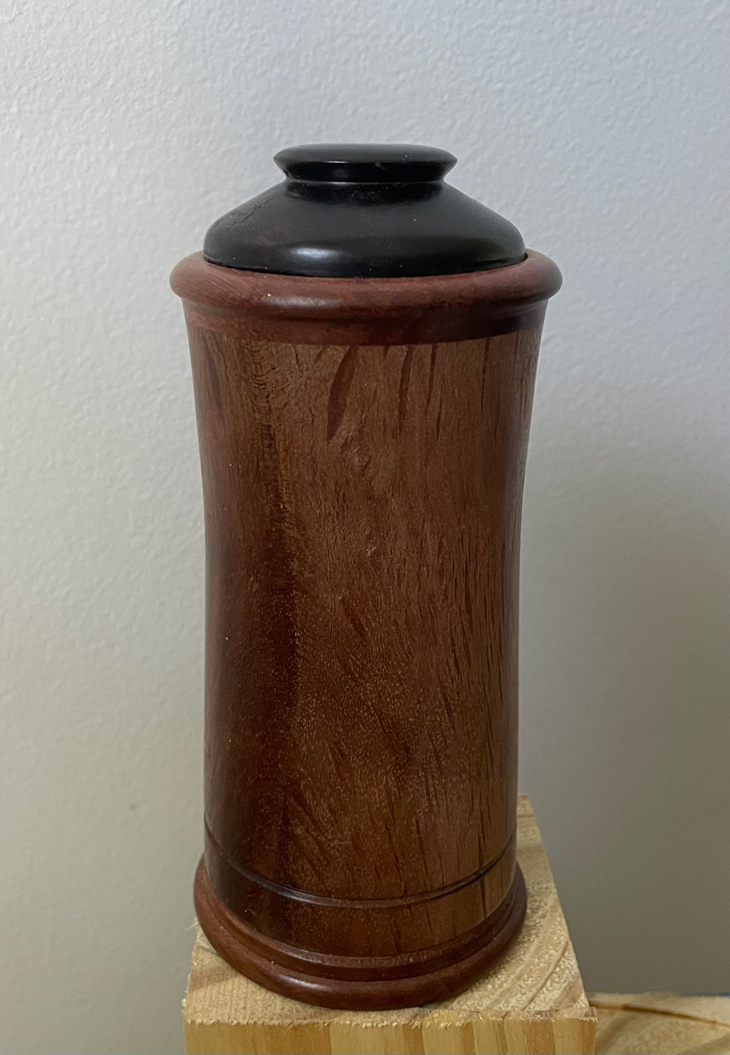 This cylindrical box has the unusual feature of showing both the heart wood and the sap wood of the Western Australian Sheoak.