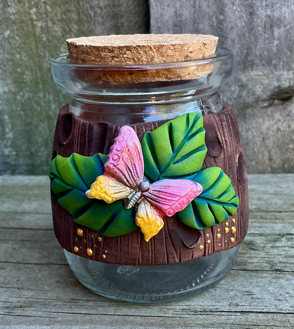 Glass jar with cork lid, covered with polymer clay.