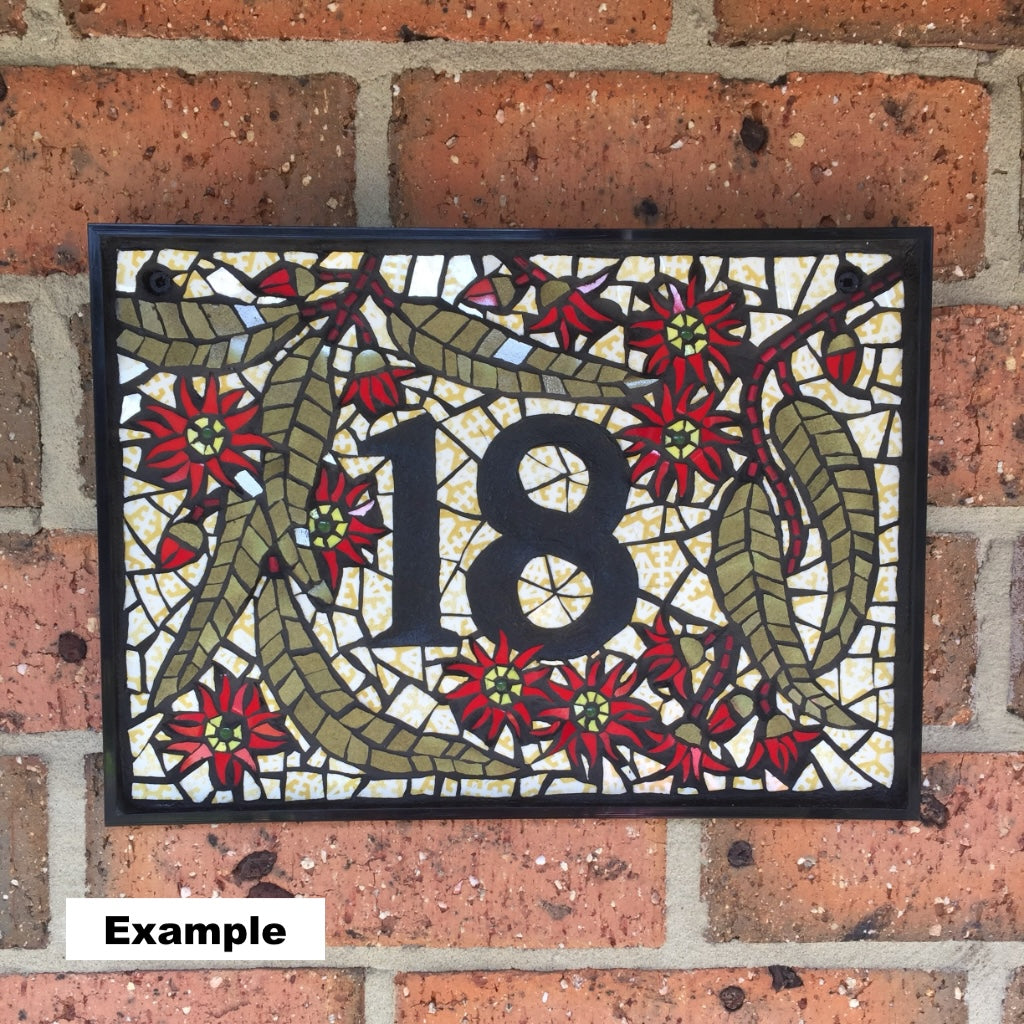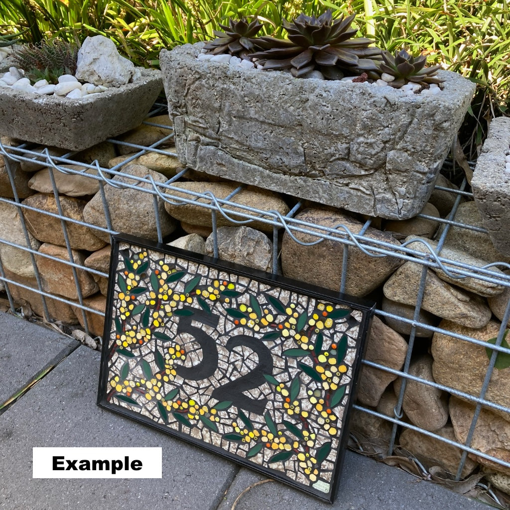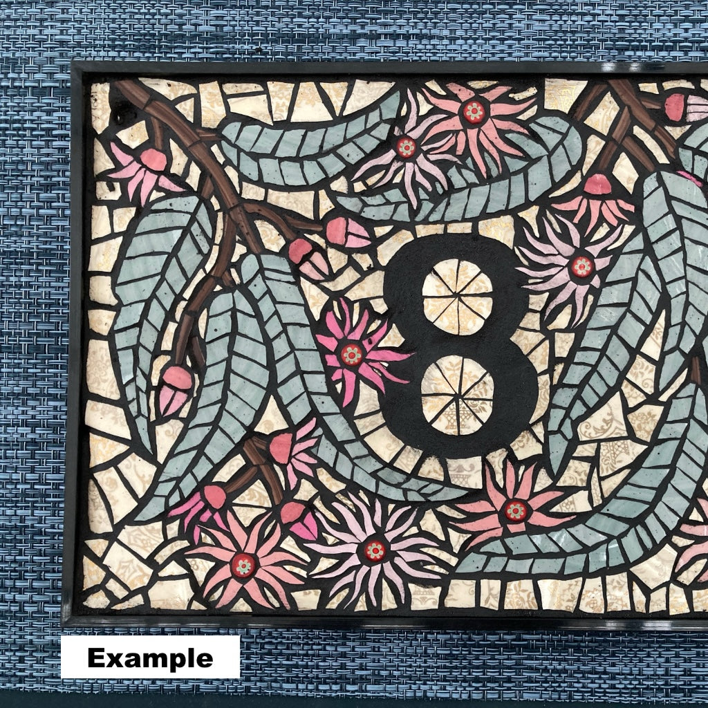 This mosaic house number sign is waiting for you to personalise it. Let me know what 1 or 2 digit number you would like and I will complete the mosaic in the style shown in the examples. Please allow 7 - 10 days for completion.