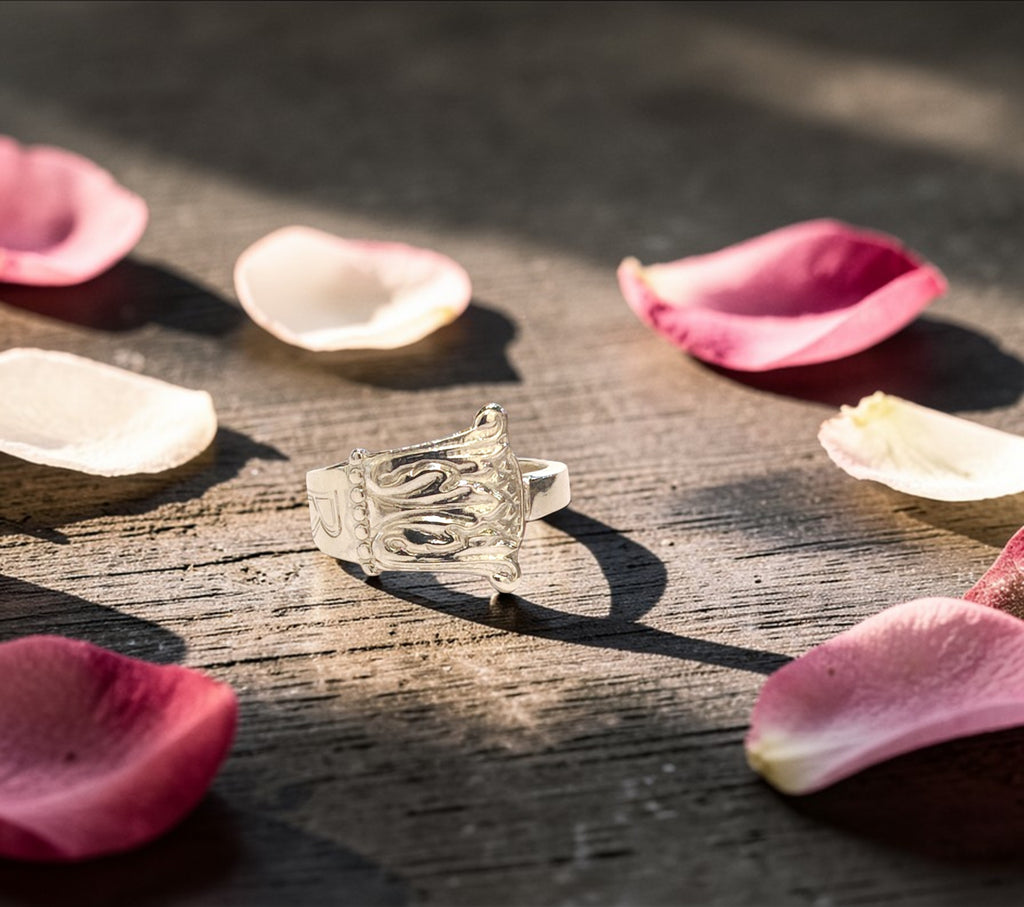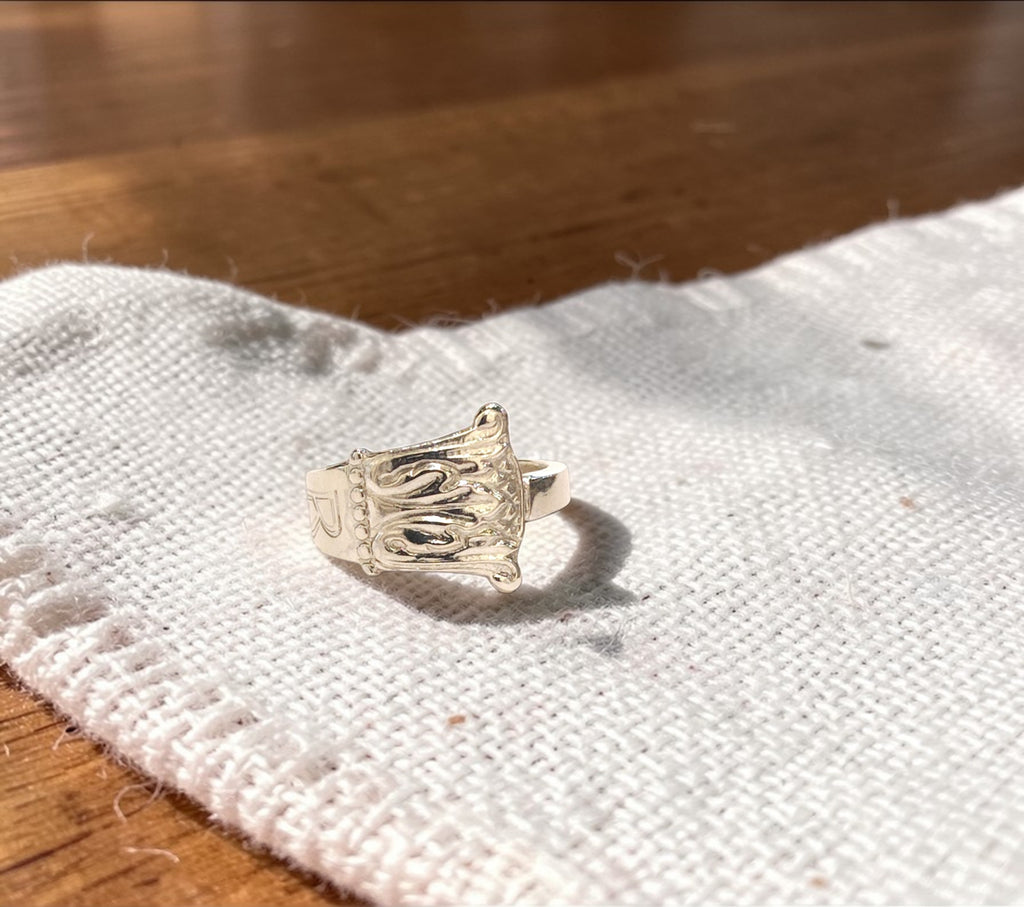 Handcrafted by Silver Rose, this piece transforms the original vintage spoon into something truly enchanting. The ring features preserved engravings, including the elegant 'B' and the year '1930' on the inside, which add a touch of nostalgia and individuality to every ring. It's clear to see the care and passion that went into creating this unique piece.