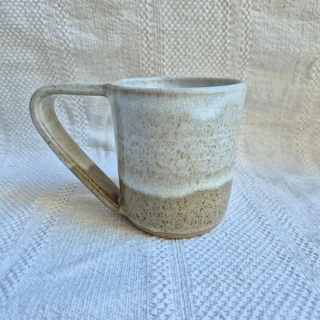 This mug is wheel thrown and dipped glazed in a combination of caspar white and yellow. A standard sized mug with a wide sturdy handle for easy gripping and comfort. Each mug will have natural variations in colour and form.