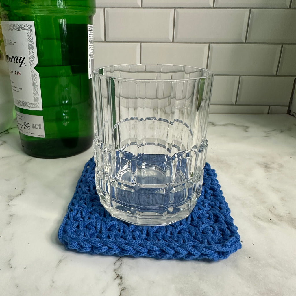 Handmade in a beautiful blue shade, this set of 4 crocheted coasters are made from sturdy braided yarn and finished with a soft, textured feel. The ocean blue colour is fresh and calming, making them a great fit for coffee tables, desks, or bedside tables.