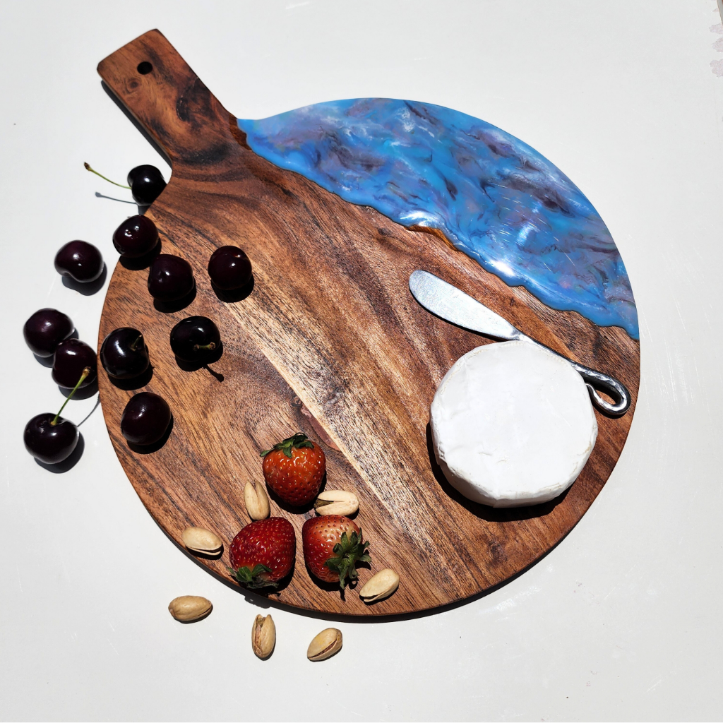 Acacia Board with non-toxic resin, dyes, mica powders and acrylic paint. Finished with 100% natural, food safe chopping board oil and wax.