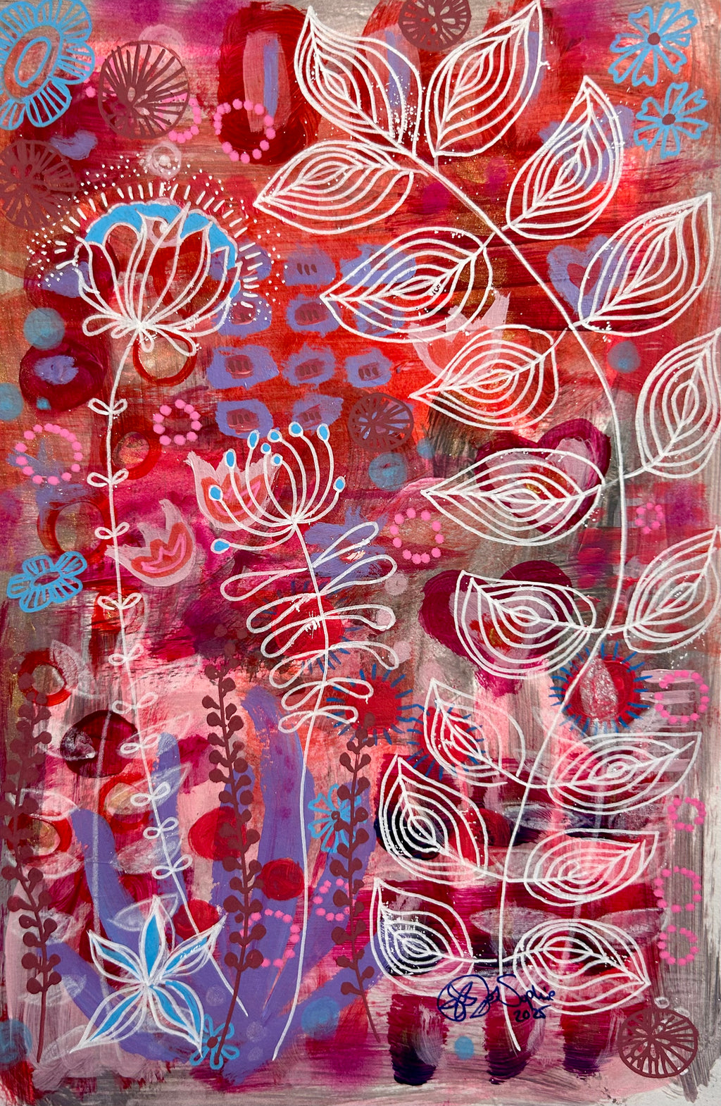 Painted in layered acrylics with fine line paint pen detailing, this original piece dances with greys , pinks and blues with lacy white details, each mark adding texture and depth to the story unfolding across the page.