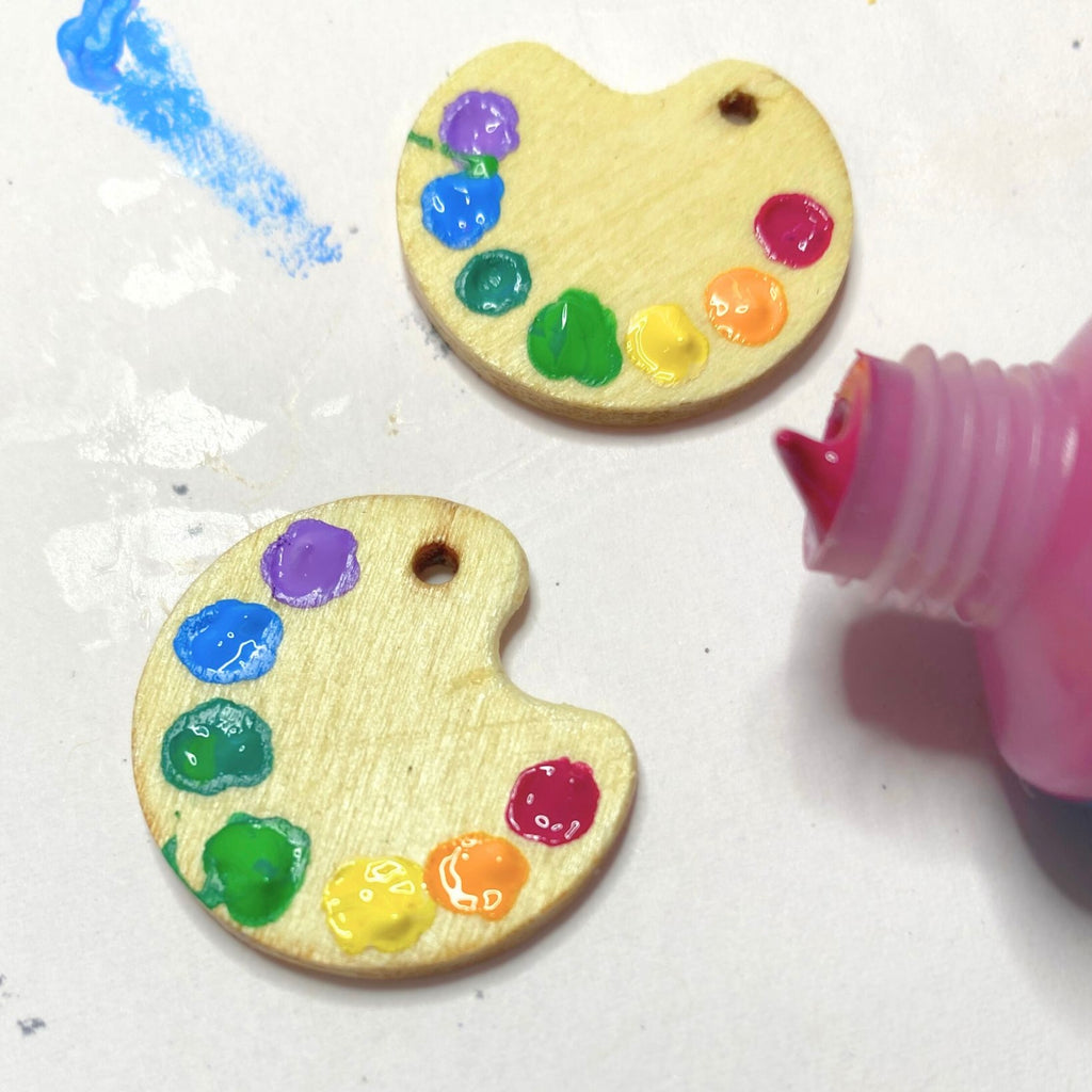 The cute miniature paint palettes are hand-carved from untreated wooden discs, indented with several tiny wells and filled with bright acrylic paint splotches.