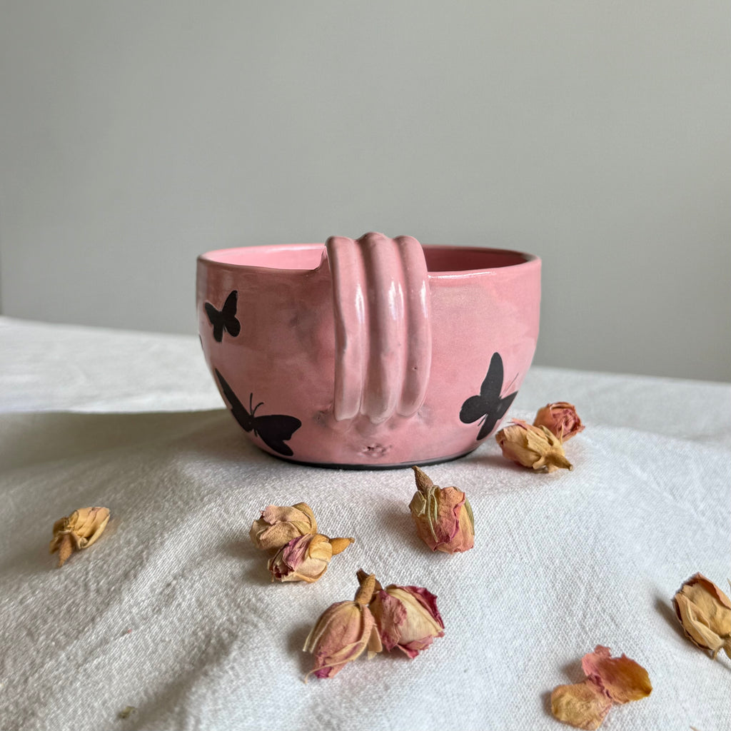 Finished in a glossy pink glaze on black clay, each piece features butterflies revealed through the glaze, exposing the raw black clay beneath.