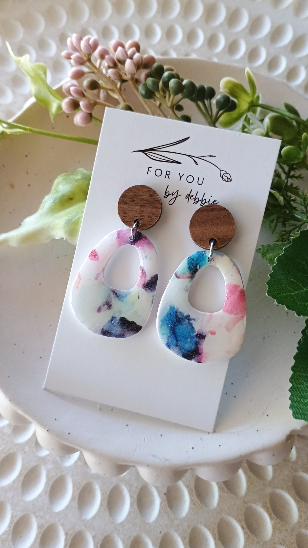 White polymer clay with an abstract splat watercolour transfer paper print, UV resin shiny finish, wood stud top, 5cm long and lightweight.
