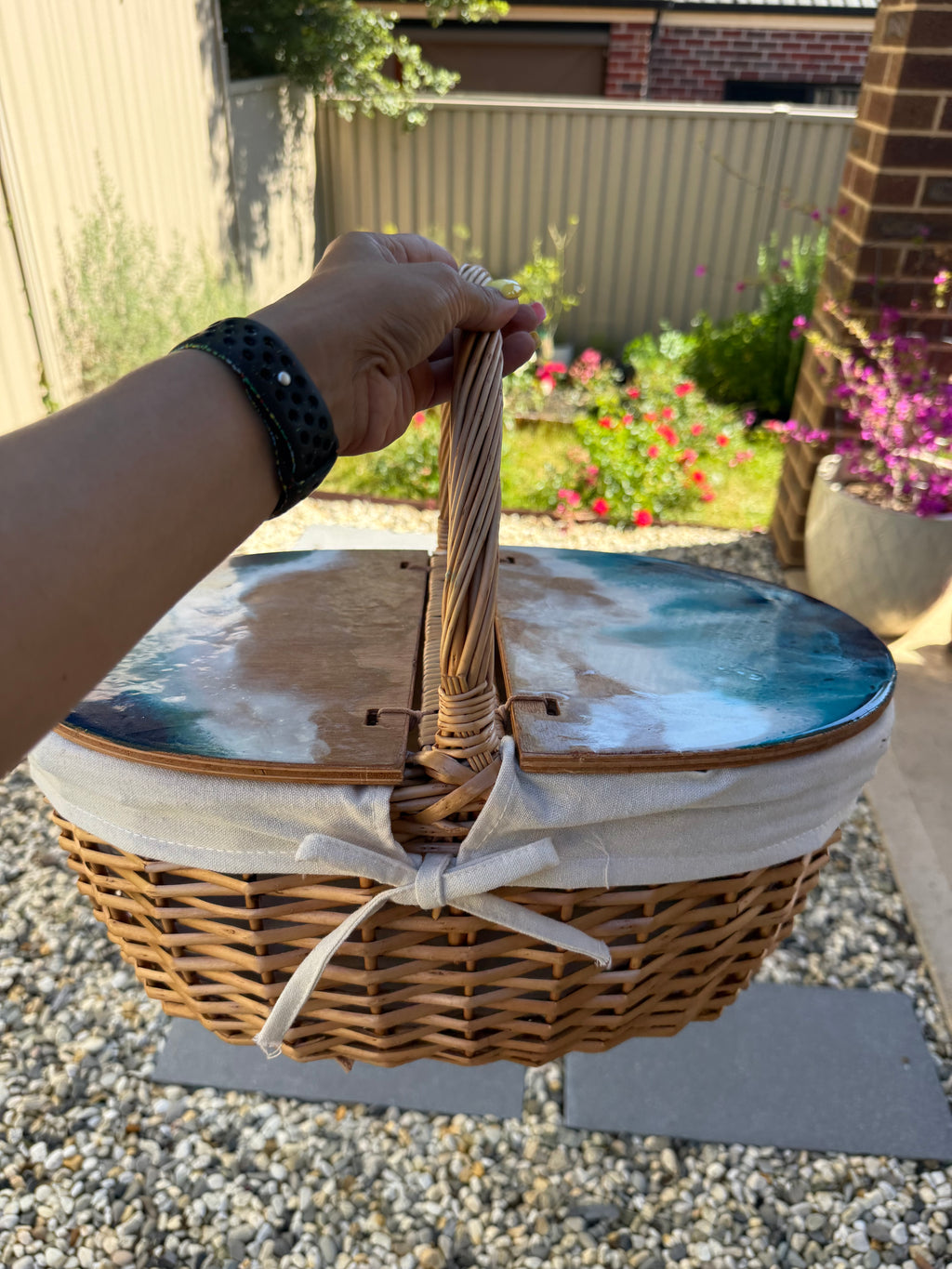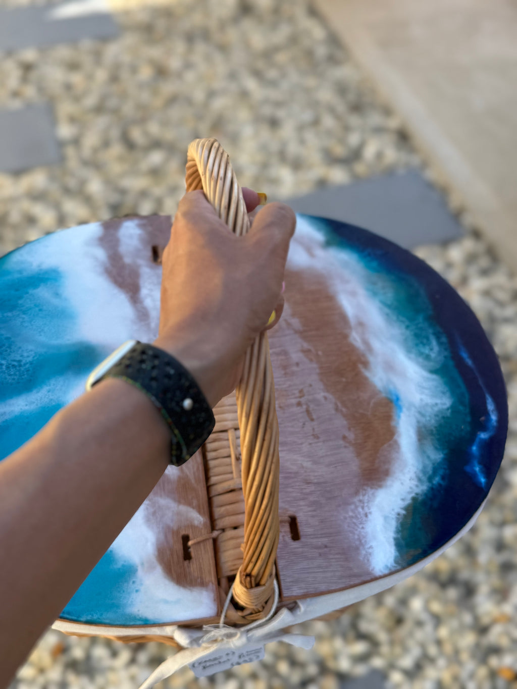 Handmade picnic basket bringing beachside ocean waters home, in style and stylistic your home and the feel of the ocean!
