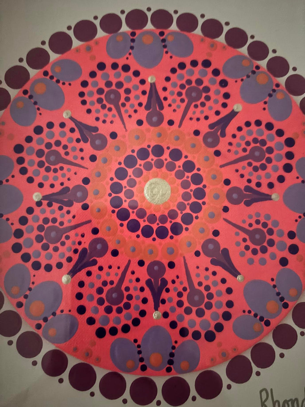 A mandala is an ancient circular design of repeated patterns and colours that radiate from the centre circle and were used for meditation and healing. Rhondalas Mandalas are a modern take on mandalas, painted for the purpose of developing creative expression to bring balance, harmony, mindfulness and a sense of calm into the mind. Every mandala I hand-dot is created with intention that reflects a moment or feeling in time.