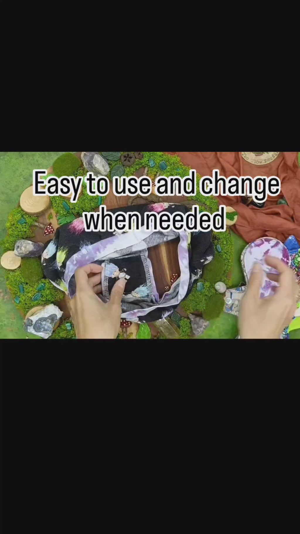 This cloth pad is made with soft to touch materials (cotton lycra, quilting cotton), two layers of 400gsm bamboo fleece for absorbency and softshell for leak resistance. The softshell fleece provides grip against underwear and pad is secured with KAM snaps. All pads are to be worn "pretty side up".