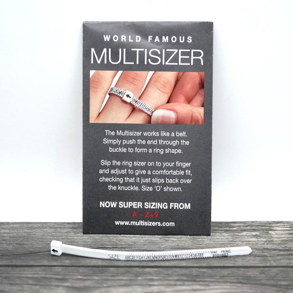 The soft plastic adjustable reusable ring sizer will help you find your ring size before purchasing a ring. The Multisizer works like a belt. You simply push the end through the buckle to form a ring shape and slip the ring sizer on to your finger and adjust to give a comfortable fit, checking that it just slips back over the knuckle.