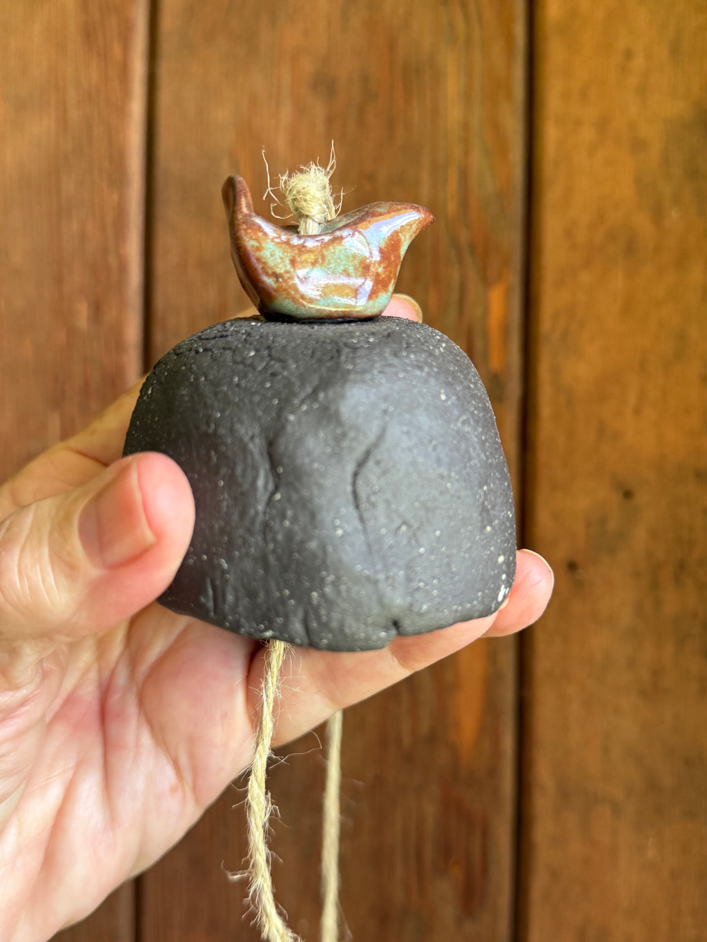 Hand made ceramic bell made with a textured brown clay. A small glazed bird sits on top of the bell. Handcrafted beads add accent to the hanger of the bell.