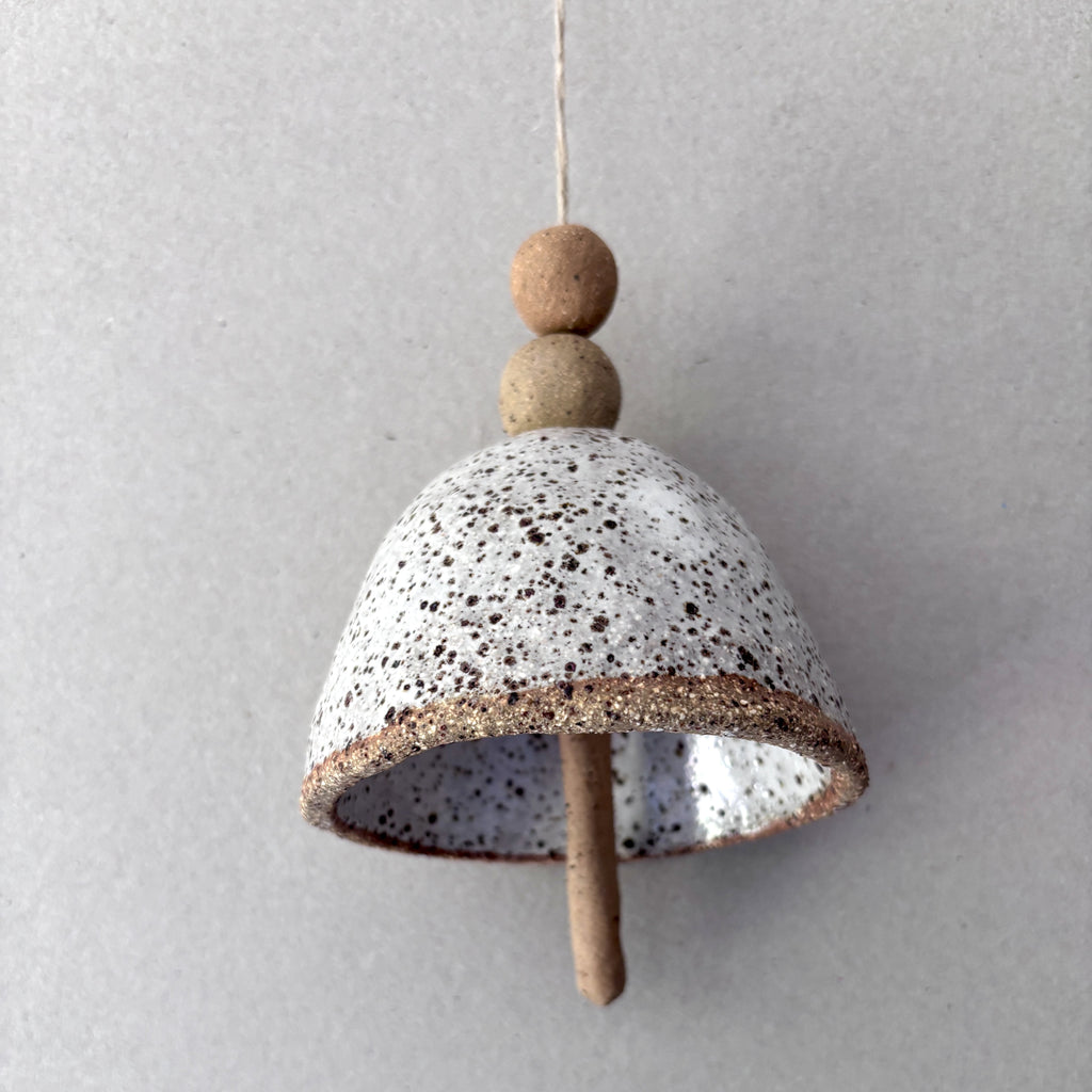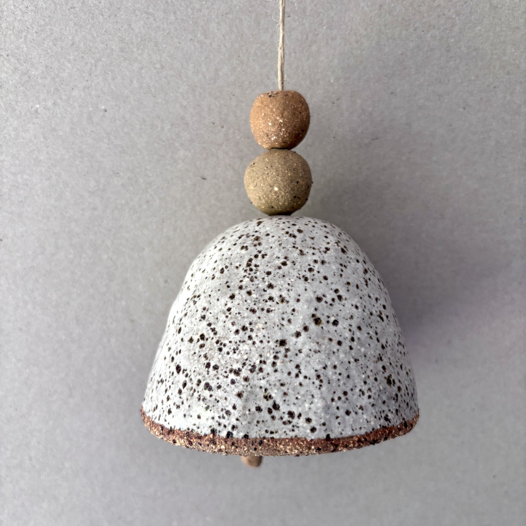 This bell is handmade from rustic Australian clay and glazed with a lovely white food safe glaze on the outside and left unglazed on the inside. It has a beautiful chime and hangs on a natural jute string.