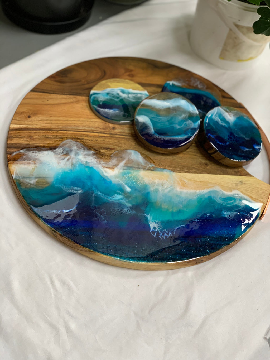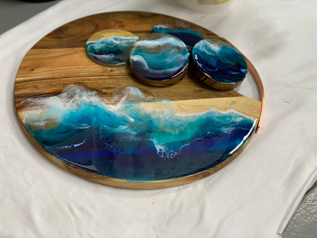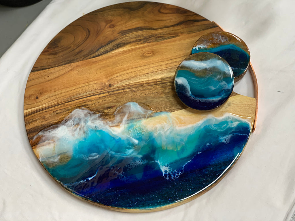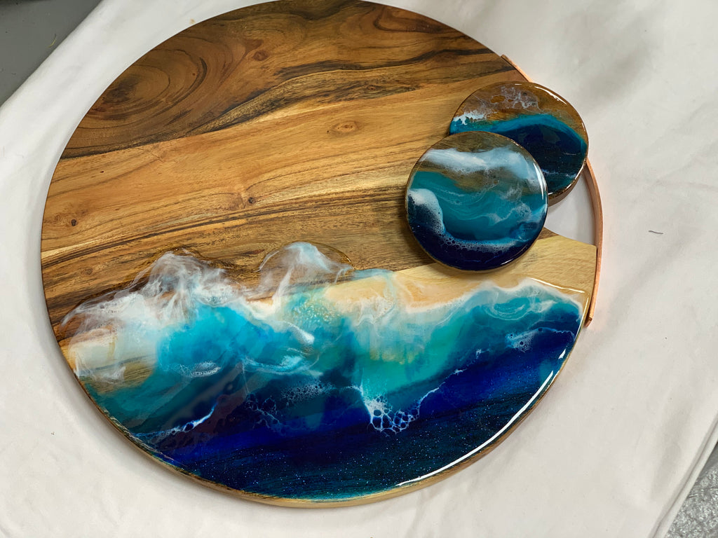 oak wooden serving board that brings home the ocean in style. Easy to carry and serve on, easy to chop in made with food safe resin.