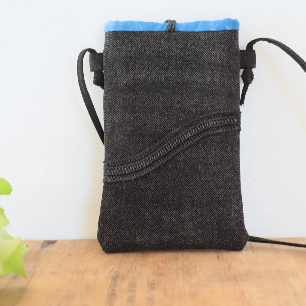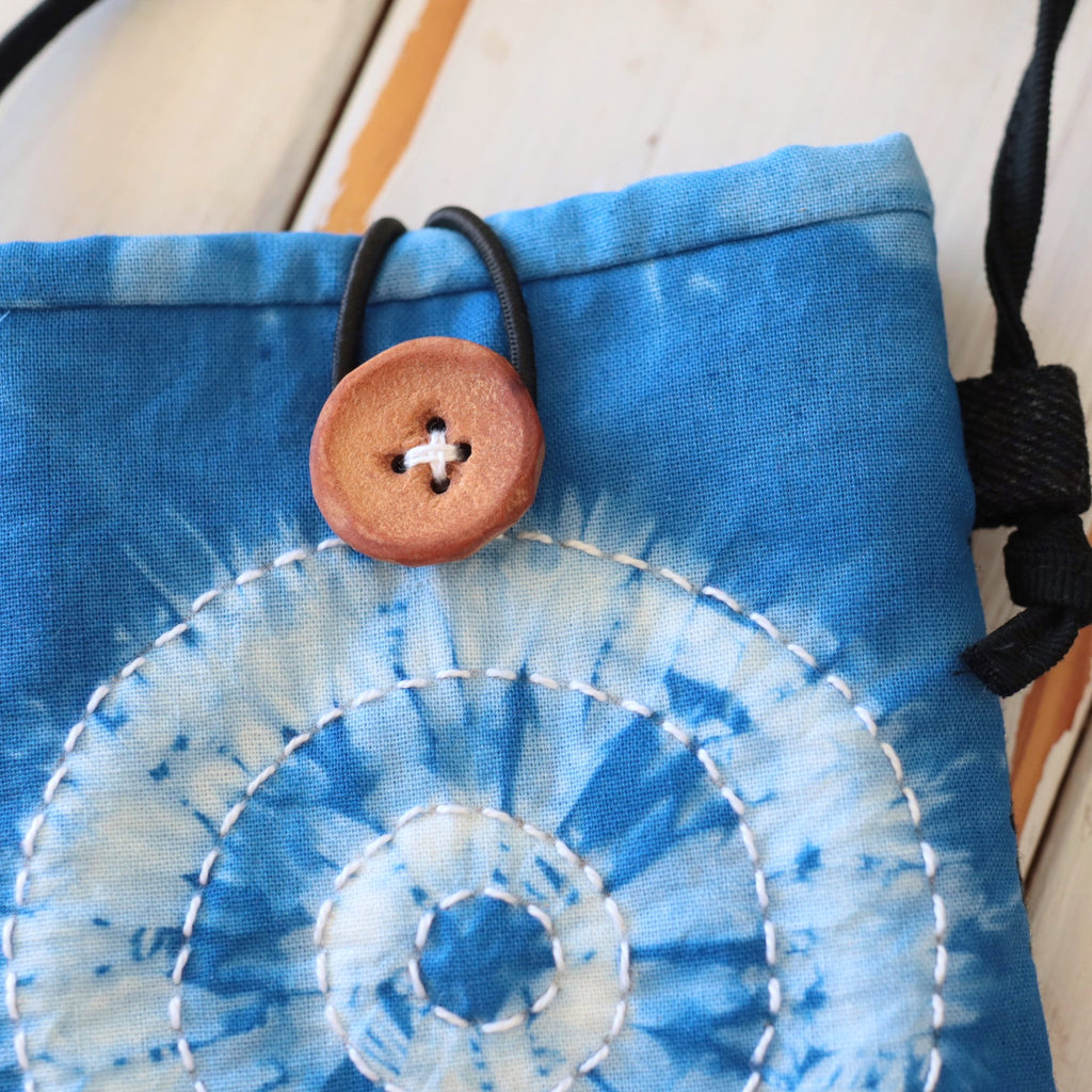 For this phone carrier I have used a dyeing method called Stitched Shibori. The circles are meticulously stitched before they are tightly pulled and then dyed. The result is always stunning and a bit magical!