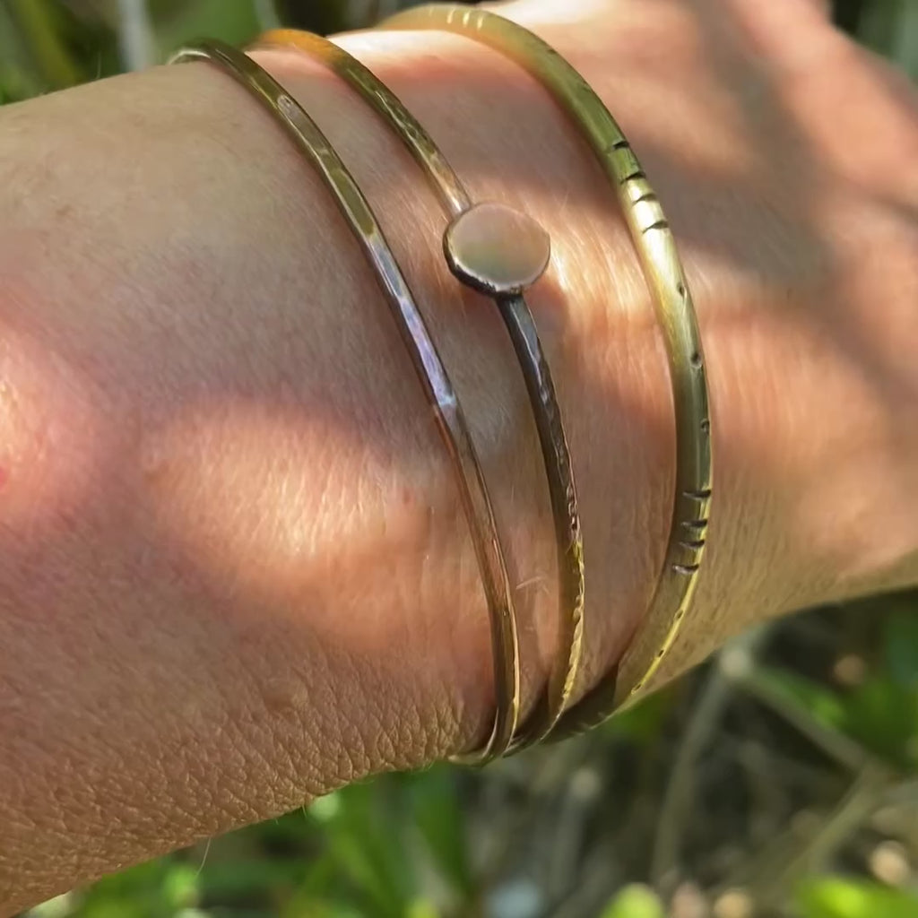 Three earthy handmade and textured stacking bangles - two in copper and one in brass - perfect for that boho person in your life or for you to add a bit of jangle to your wrist. Mixed metals always look great together so these are sold as a set of three.