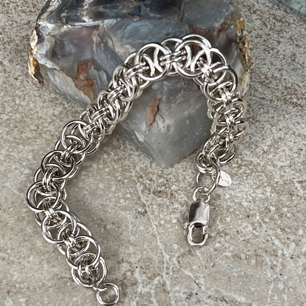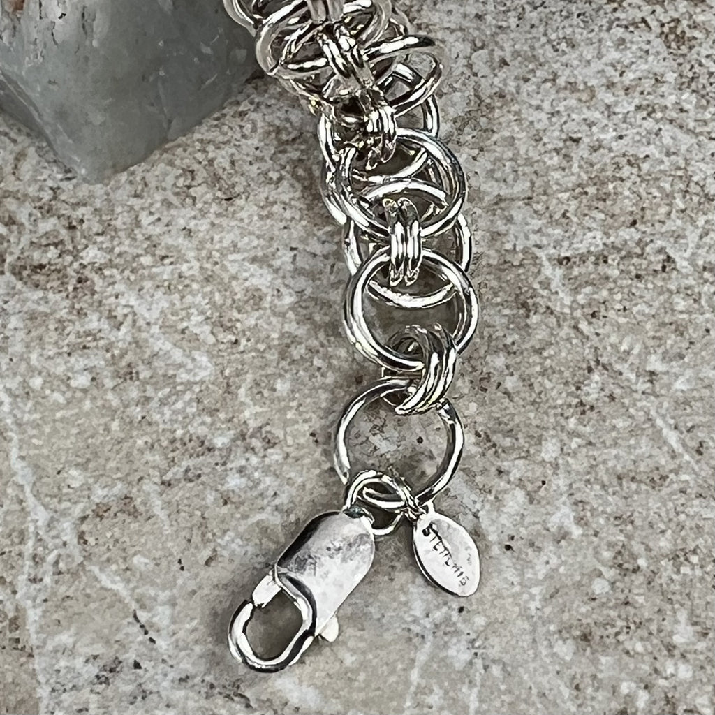 The wire is cut into 100s of links, each link then opened, woven, and then closed meticulously for the length of the bracelet. A tiny disc is then stamped "sterling" and attached before being tumbled for a few hours to smooth all the surfaces and ensure a brilliant shine.