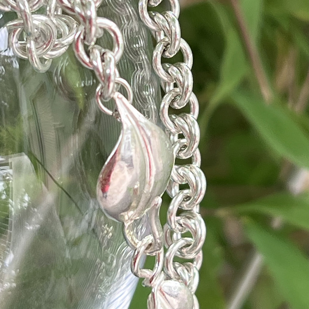 The wire is cut into 100s of tiny links that are then opened, woven, and closed meticulously into “flowers” or “rosettes” along the length of the bracelet. It is finished with a beautiful leaf clasp and a tiny disc that is stamped "sterling" before being tumbled for a few hours to smooth all the surfaces and ensure a brilliant shine.