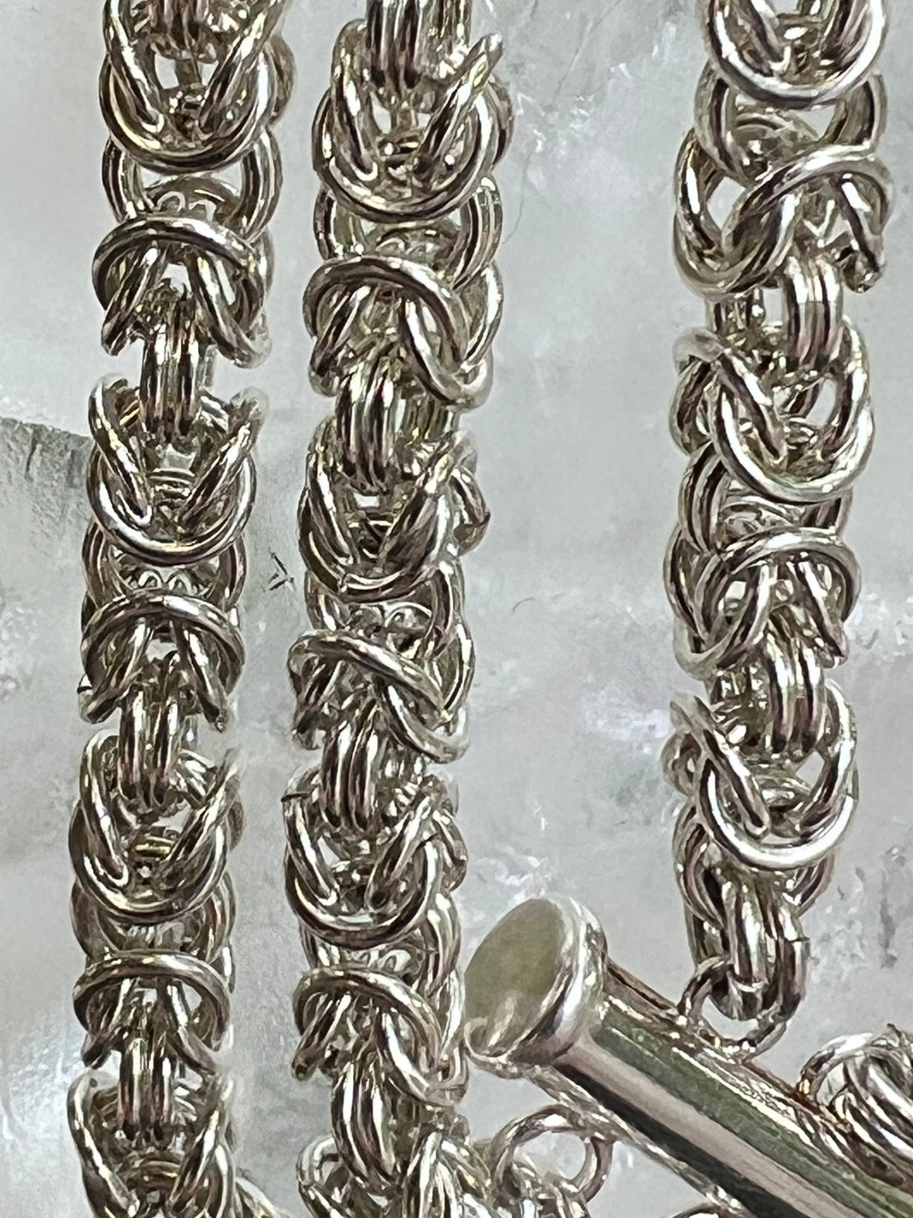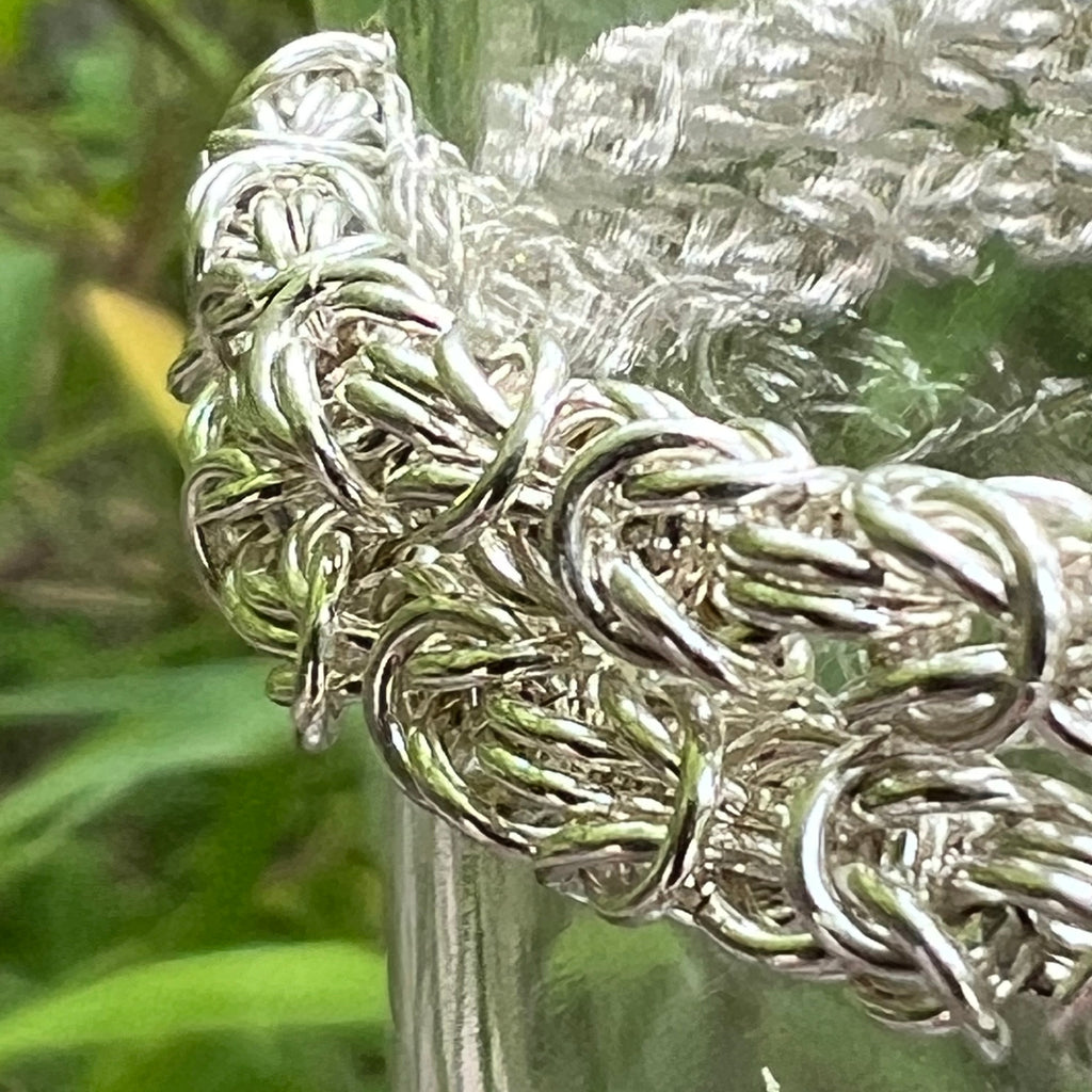 This beautiful double bracelet, woven into a “Byzantine” design, is made from 0.8mm diameter sterling silver wire purchased through a precious metal merchant.