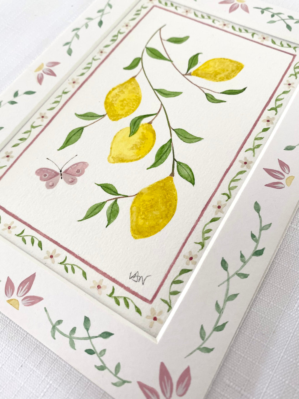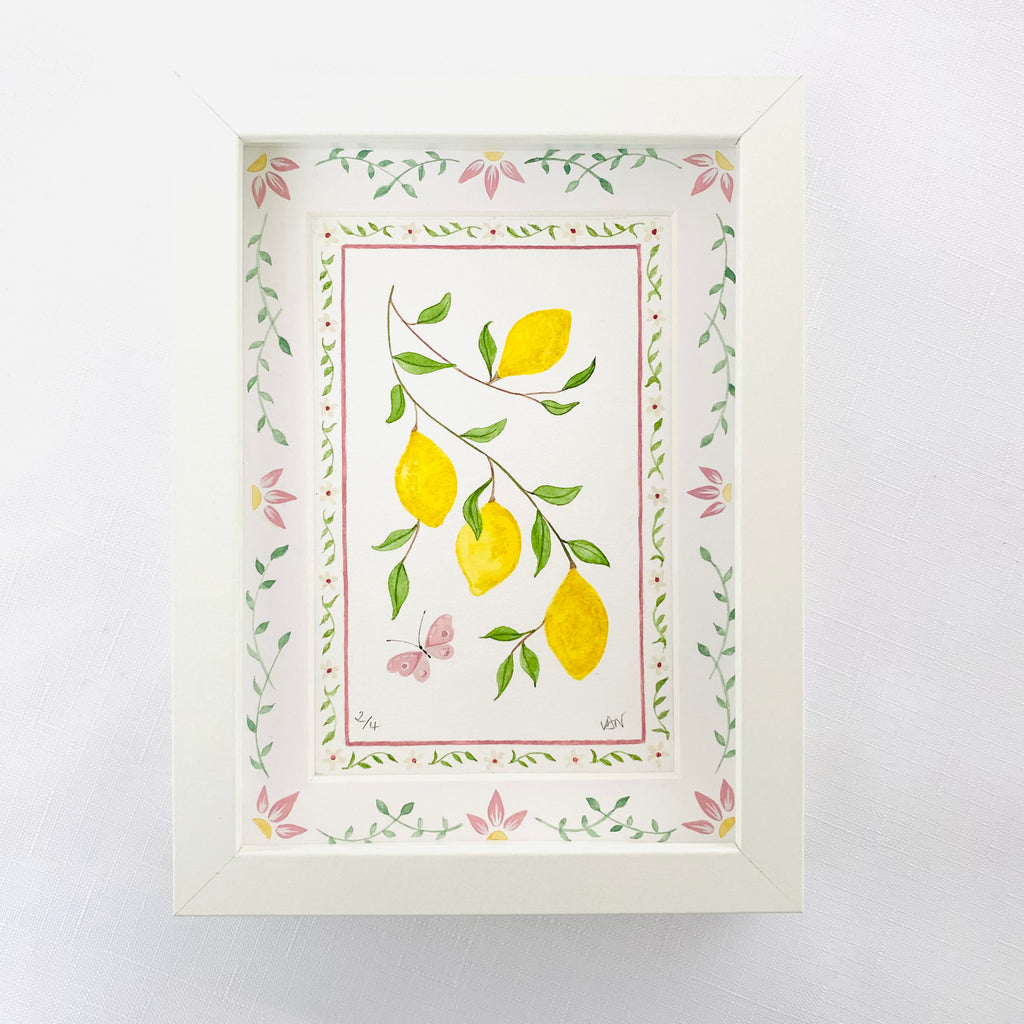 Inspired by all the little joys of summertime, this small watercolour painting features a branch of leafy summer lemons with a decorative border and hand-painted mount board in a warm white frame.