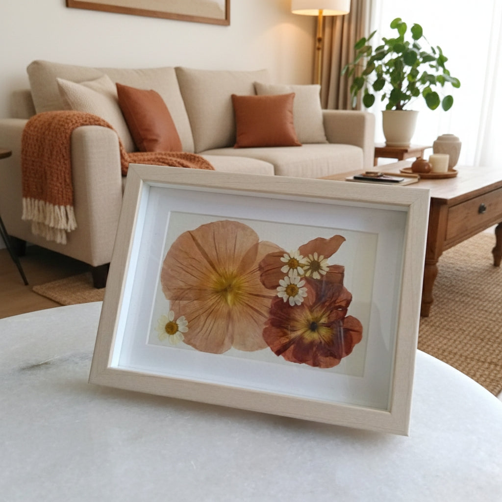 Handcrafted with real flowers pressed the traditional way. Our process honours the plant's natural pigments and form, revealing the delicate veins and soft textures of each botanical. A timeless, nature-inspired way to send a message — and once framed, it becomes a beautiful keepsake gift to be cherished forever. (Note that the frame in the picture is for illustration purposes only).