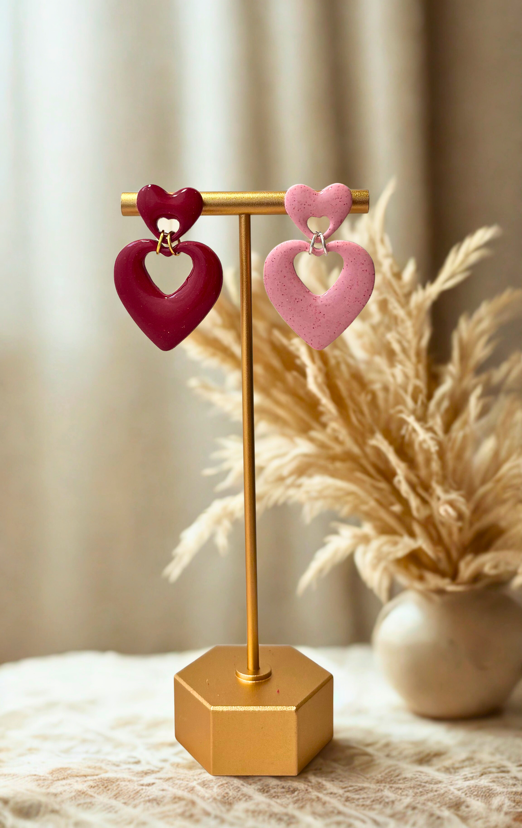 Handmade from polymer clay and finished with a high-gloss UV resin shine, these heart drops feature a sweet top heart paired with a larger open heart below, creating gentle movement and a bold vintage feel. Lightweight and comfortable, they’re designed to add a pop of personality without weighing you down.