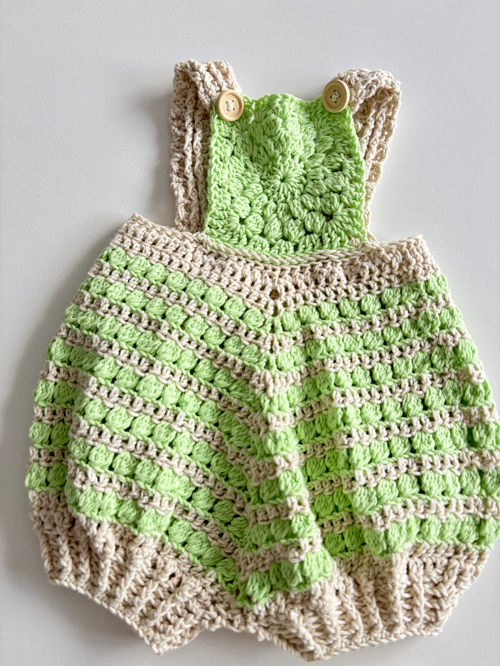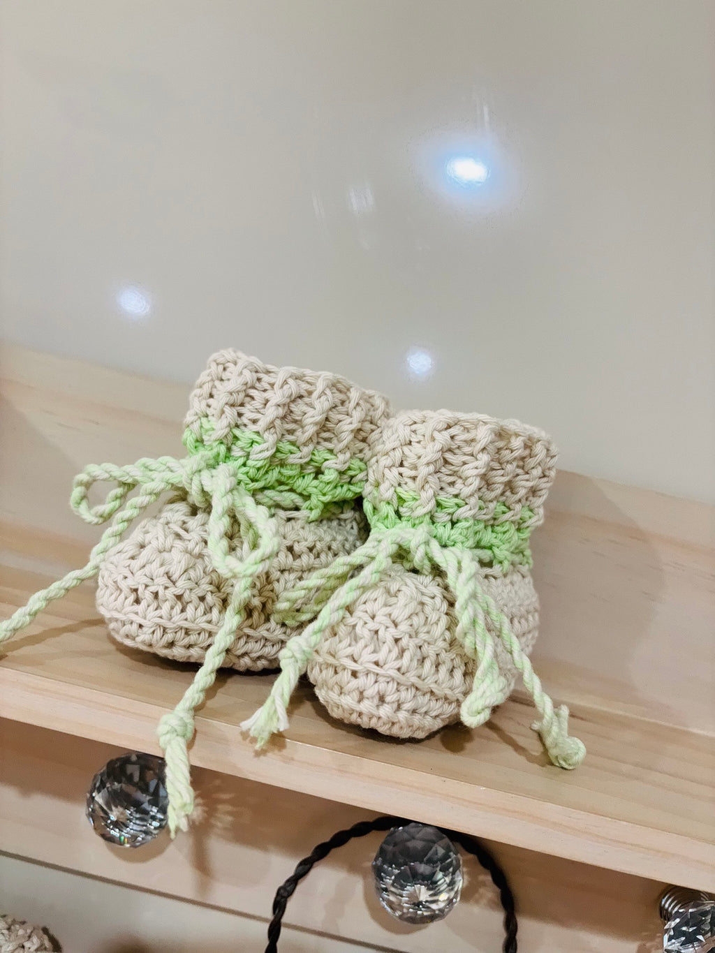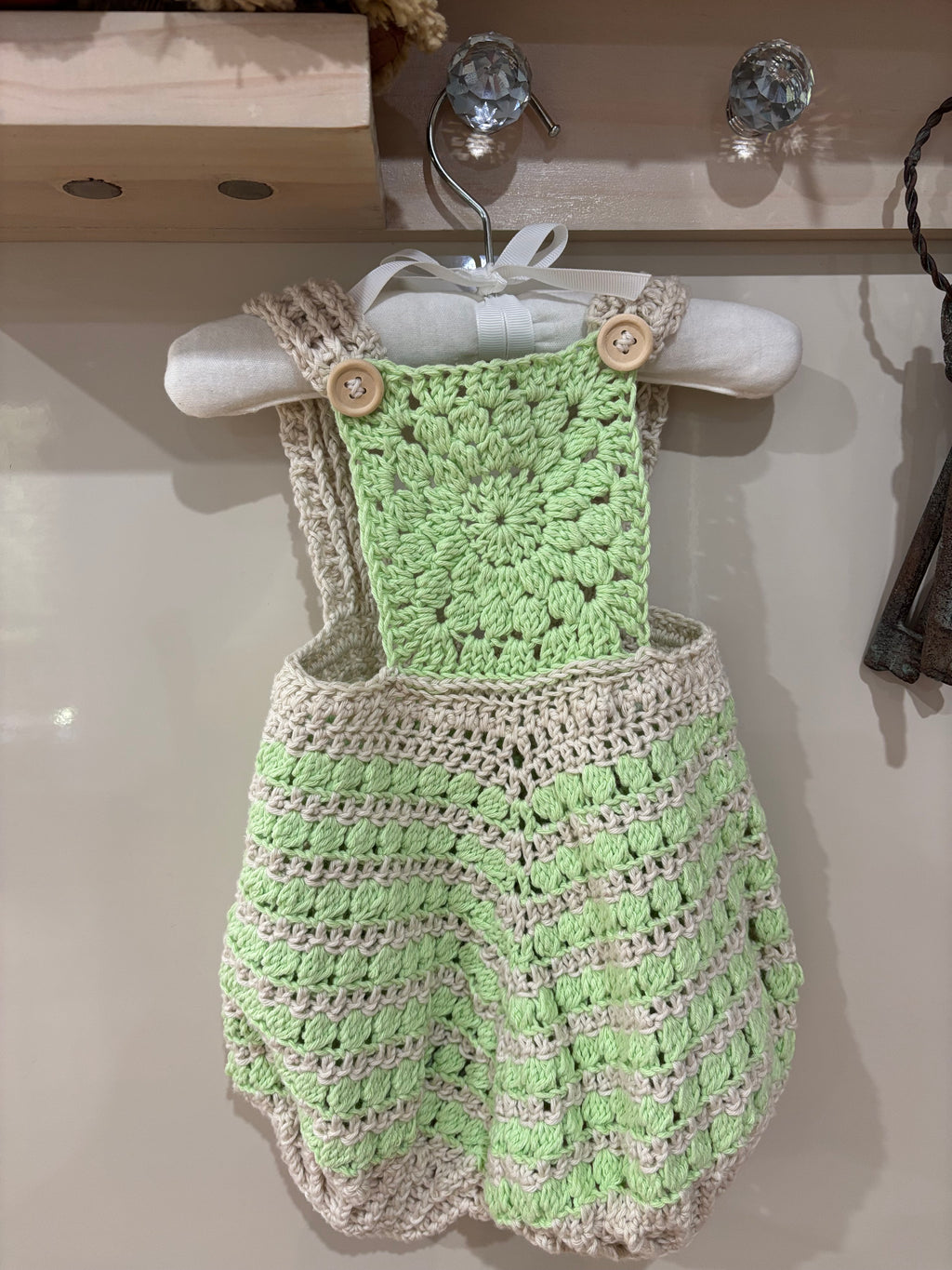 Crocheted newborn romper and booties set in soft and breathable cotton. This heirloom quality set is sure to be a family favourite. Your new little snuggler will look super sweet in the gender neutral set in pale green and stone . Sized for newborn to 6 months. Gift boxed and ready for delivery.