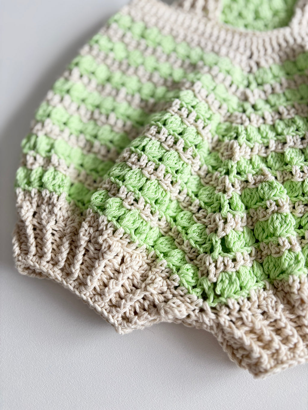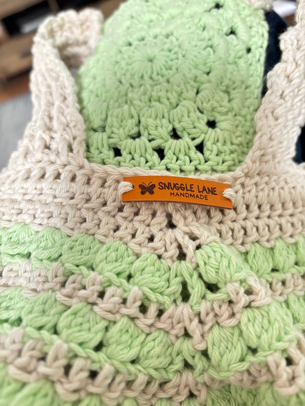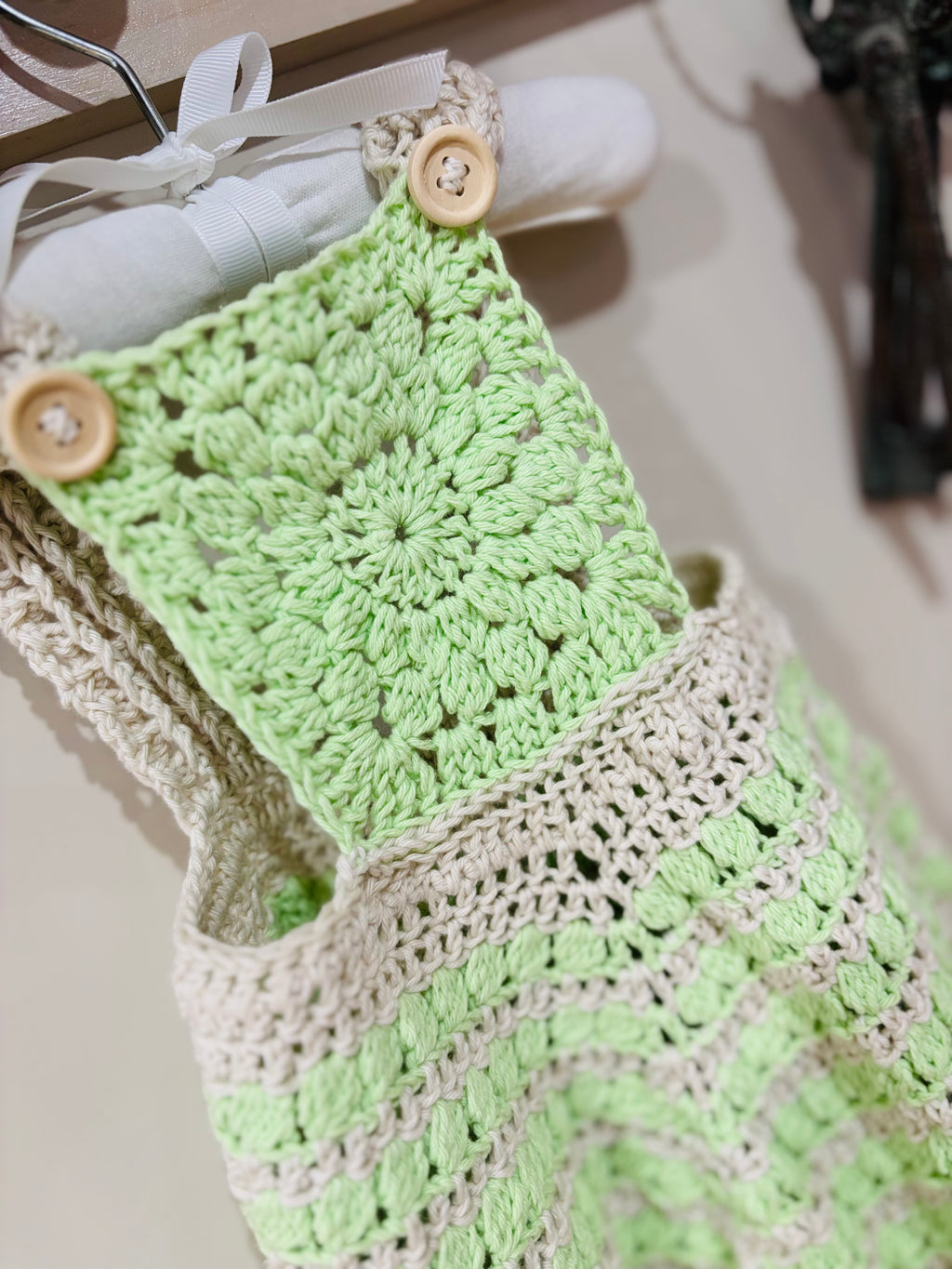 Crocheted newborn romper and booties set in soft and breathable cotton. This heirloom quality set is sure to be a family favourite. Your new little snuggler will look super sweet in the gender neutral set in pale green and stone . Sized for newborn to 6 months. Gift boxed and ready for delivery.