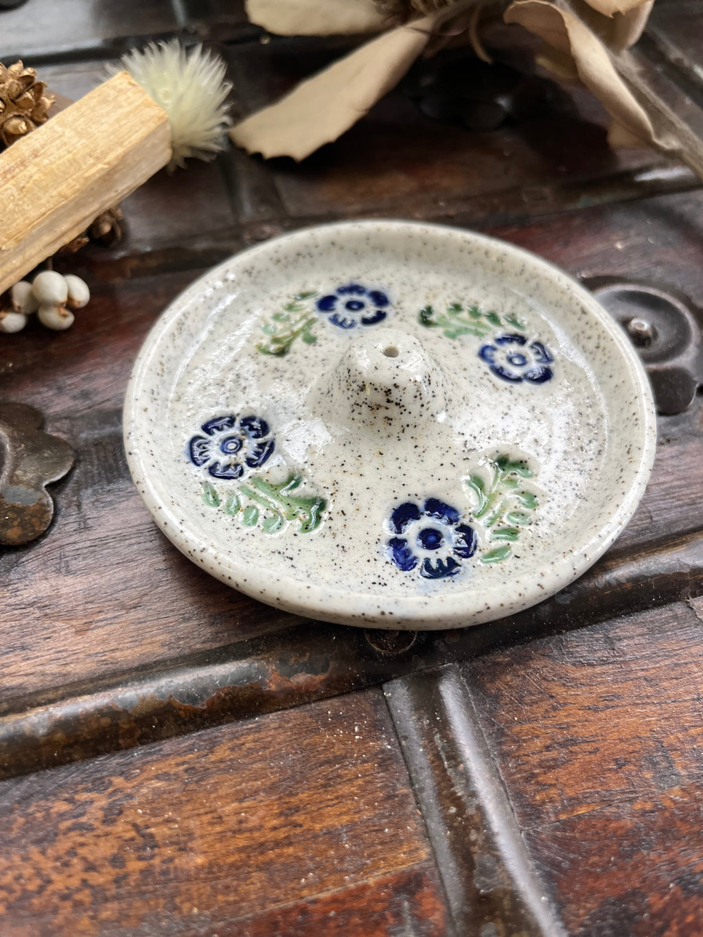 This Incense Holder has been wheel‑thrown using speckled white clay and finished with a clear glaze to highlight its subtle texture. The floral imprints are brought to life in vibrant blue and green tones, adding a fresh pop of colour against the soft, natural base.