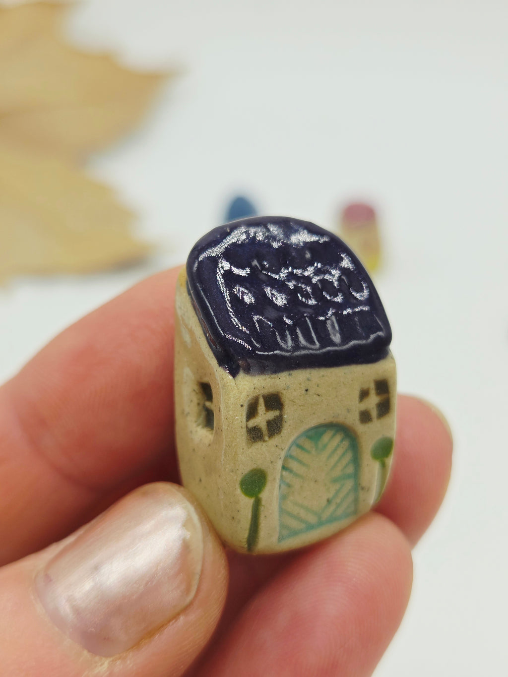 Houses look great on a shelf, in a printer's tray display, in a plant pot, as part of a fairy garden (they are high fire ceramics so are fine out in the weather), in a bonsai pot, as part of a tiny house display - the possibilities are endless.