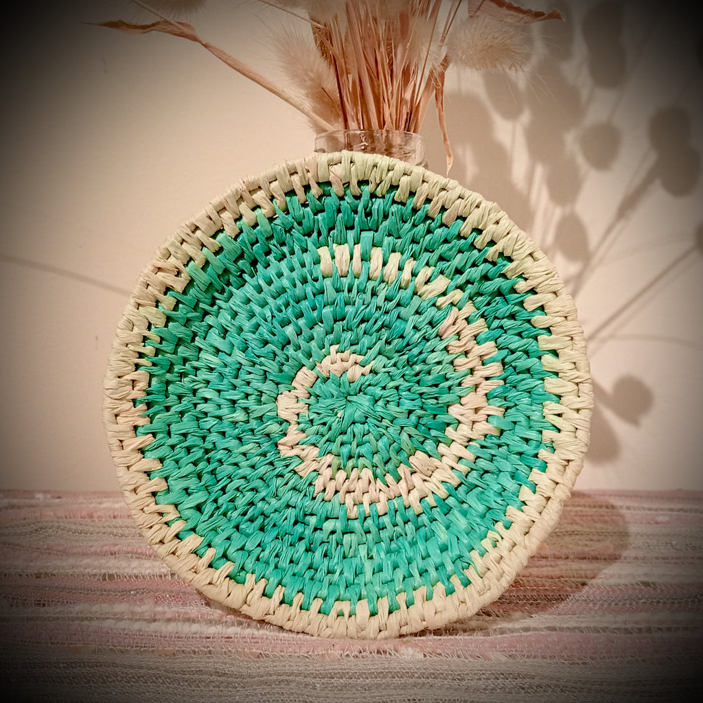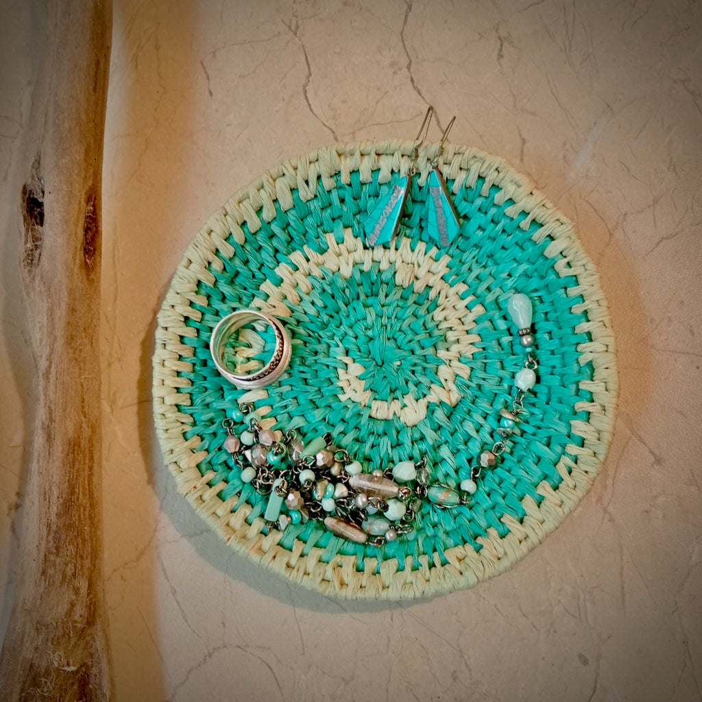 Sweet little trinket dish woven from sustainable Madagascan raffia. This one is a gorgeous turquoise with a pale green swirl woven into it.
