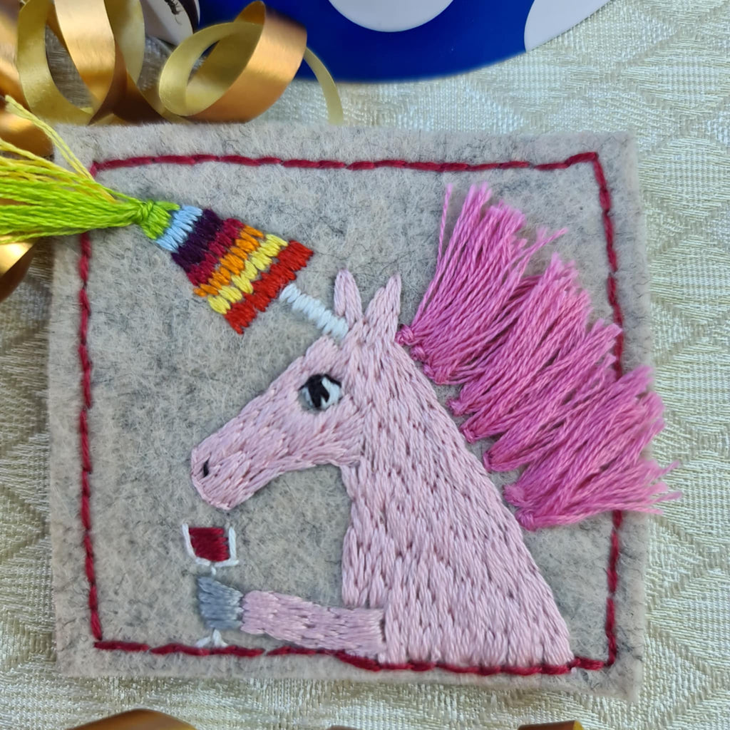 The brooch is approx 7cm x 7cmcreated on felt using DMC embroidery cotton. Unicorn has been embroidered with love. The Party Animals I have been embroidering have all been created by me and each has its own personality and little story to go with it. These brooches are for someone who loves the feel of textiles in their hand and enjoys the fun of original designs. Unicorn is looking for someone to have Wild Party times with !