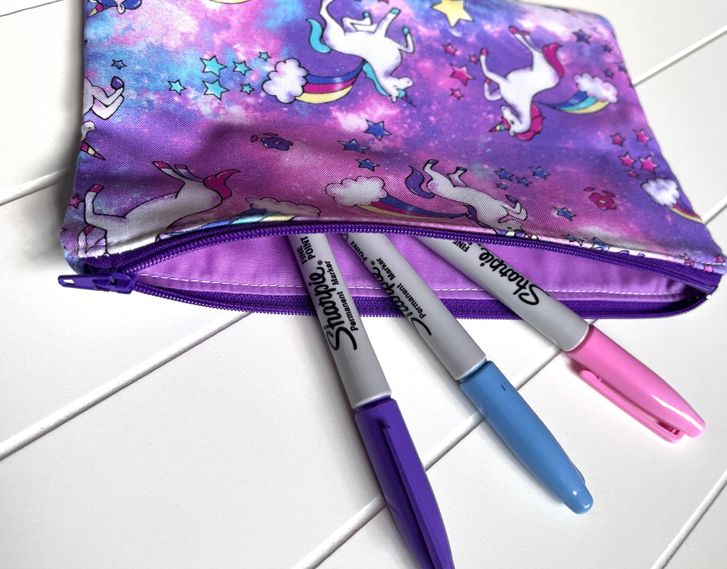 Cotton unicorn fabric pencil case. The pencil case is lined with white fabric and is padded for softness.