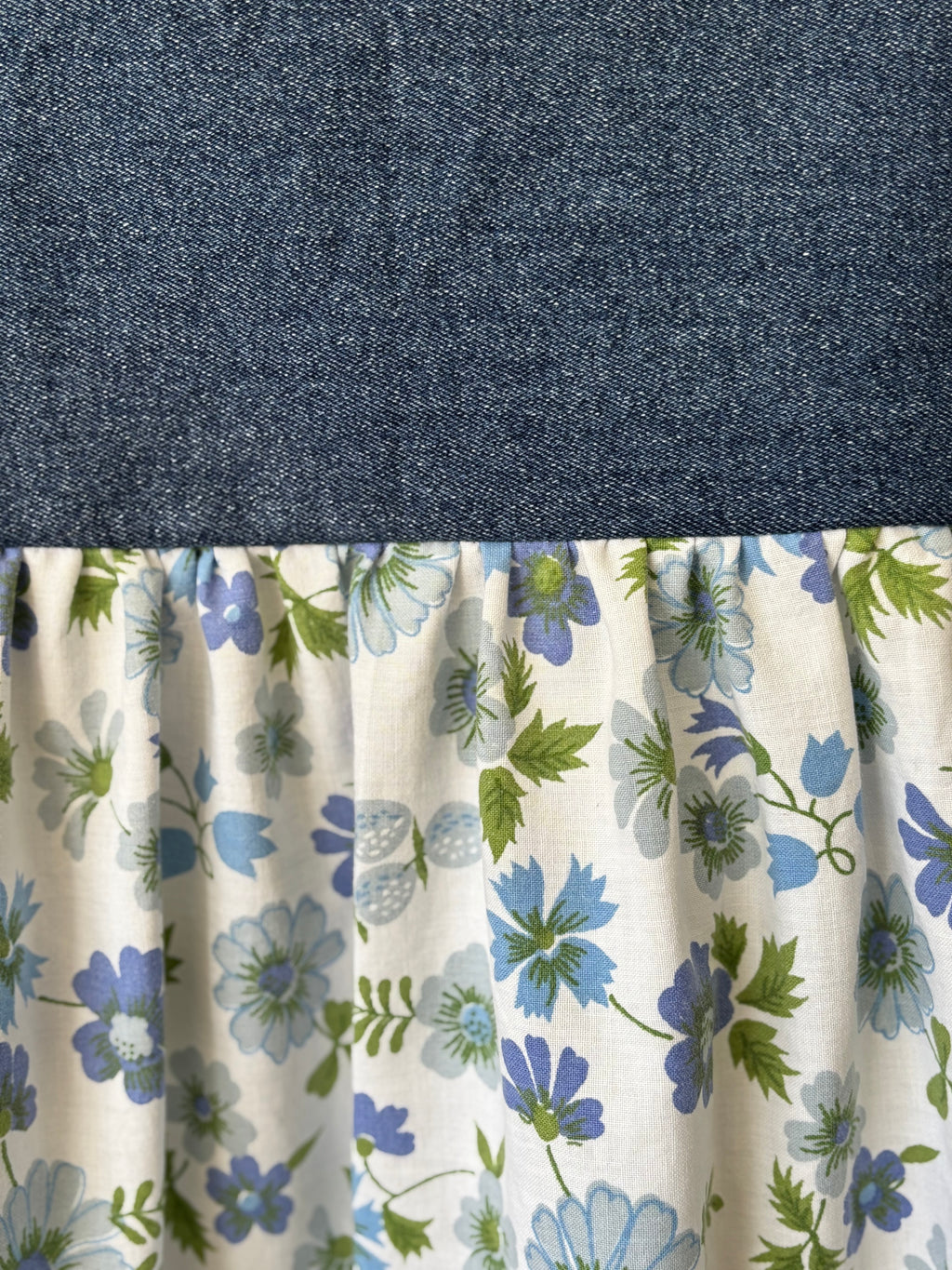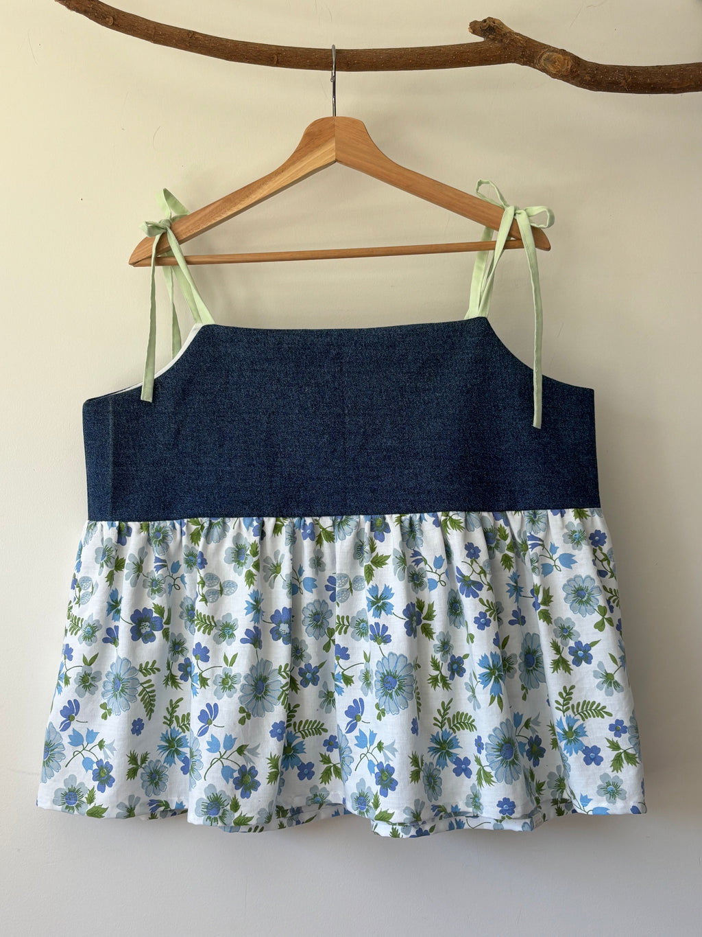 This sweet babydoll top features a fully lined denim bodice made from thrifted jeans, paired with a floaty, floral lower panel repurposed from vintage bed linen. The silhouette is designed to be slightly oversized. Adjustable shoulder ties in a contrasting green fabric add a pop of colour and let you customise the fit.
