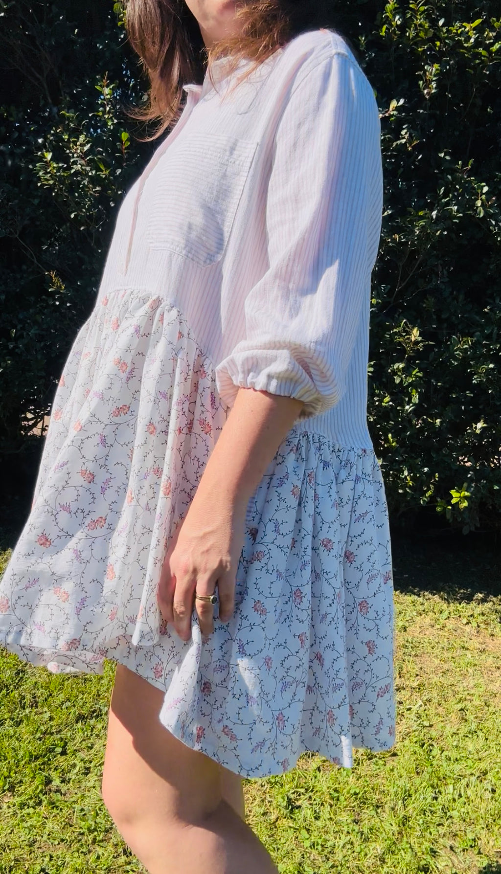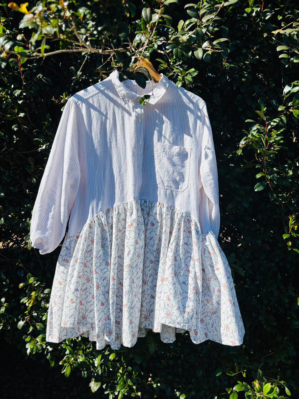 This floaty, feminine upcycled dress has been reimagined from a women’s striped long-sleeve shirt and a soft cotton floral bedsheet. The bodice features fine beige stripes with gathered ¾ sleeves and a partial button front, while the voluminous asymmetrical skirt showcases delicate coral and purple floral vines. The combination of a dramatic full skirt and a gently tailored top creates a beautiful, elegant balance.